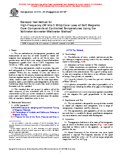 1.1 This test method covers the equipment, procedures, and measurement of core loss of either toroidal or mated soft magnetic core components, such as soft ferrite cores, iron powder cores, and so forth, over ranges of controlled ambient temperatures typically from -20 to +120oC, frequencies from 10 kHz to 1 MHz, under sinusoidal flux conditions.