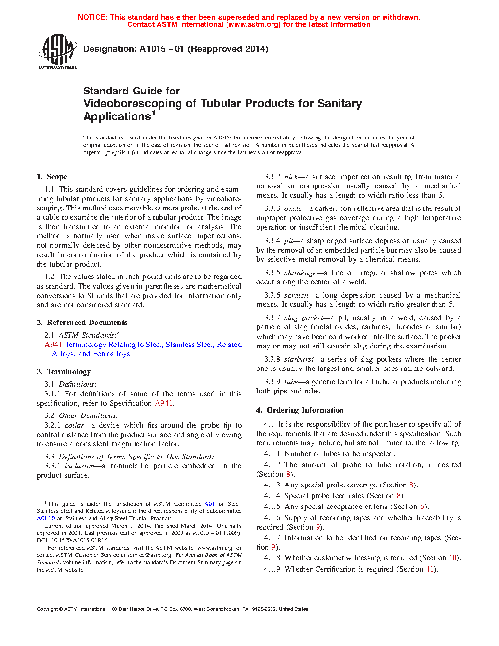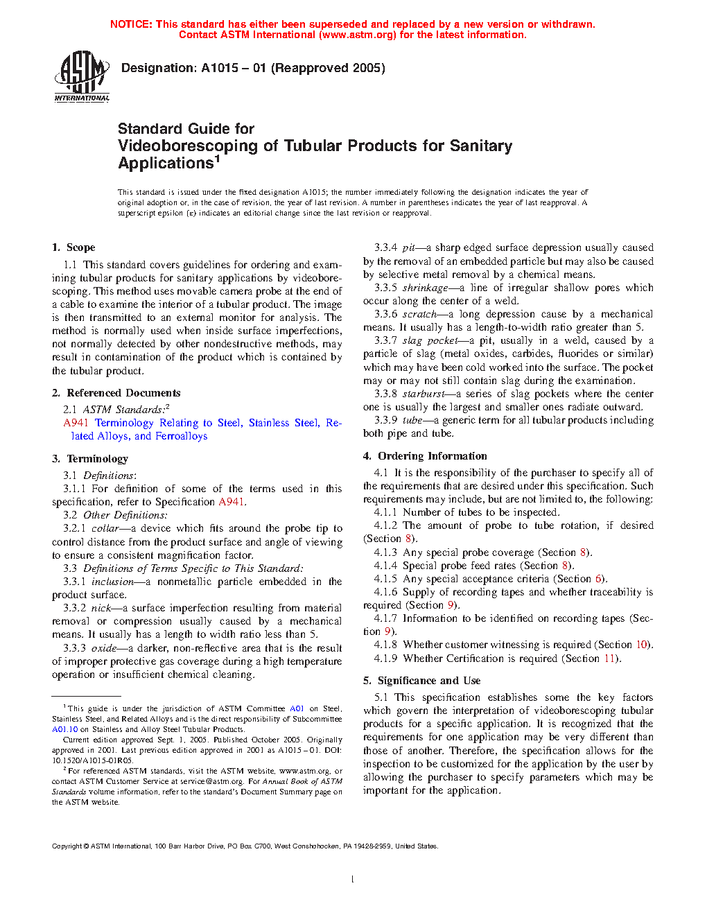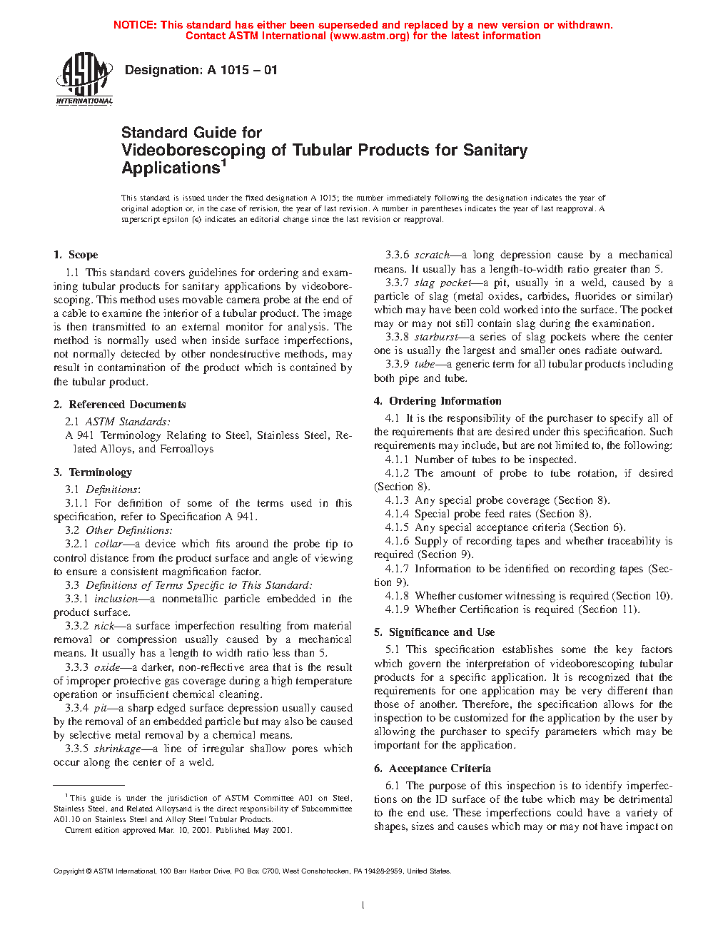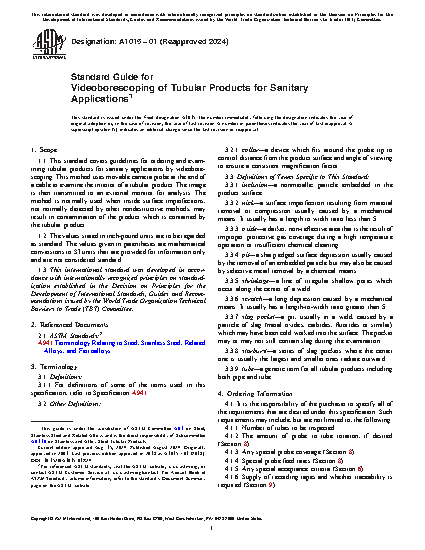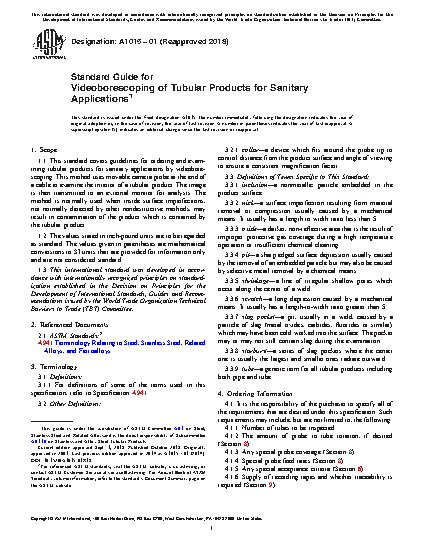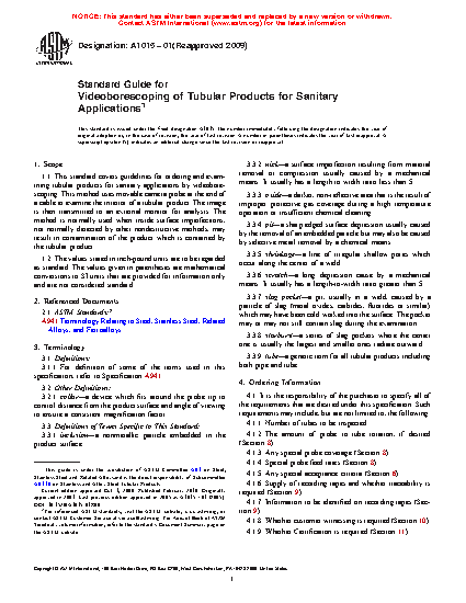 1.1 This standard covers guidelines for ordering and examining tubular products for sanitary applications by videoborescoping. This method uses movable camera probe at the end of a cable to examine the interior of a tubular product. The image is then transmitted to an external monitor for analysis. The method is normally used when inside surface imperfections, not normally detected by other nondestructive methods, may result in contamination of the product which is contained by the tubular product.