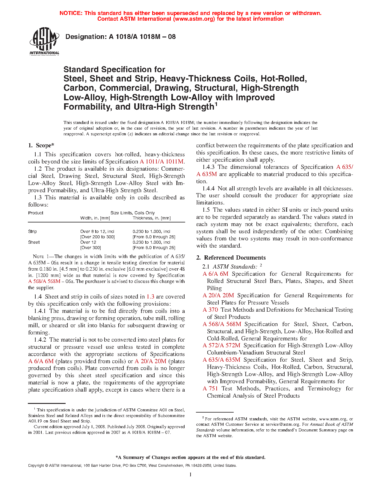 Note 1: The changes in width limits with the publication of A635/A635M – 06a result in a change in tensile testing direction for material from 0.180 in. [4.5 mm] to 0.230 in. exclusive [6.0 mm exclusive] over 48 in. [1200 mm] wide as that material is now covered by Specification A568/A568M – 06a. The purchaser is advised to discuss this change with the supplier.