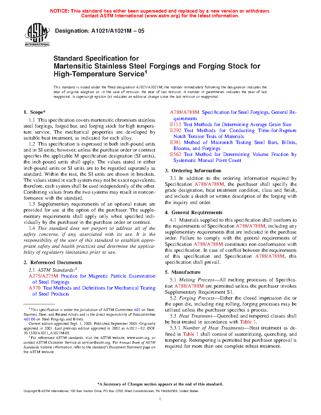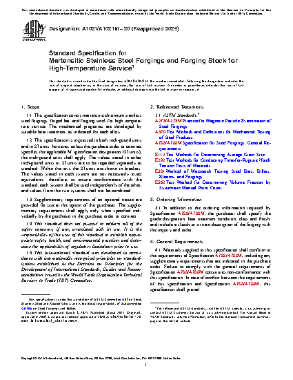 1.1 This specification covers martensitic chromium stainless steel forgings, forged bar, and forging stock for high temperature service. The mechanical properties are developed by suitable heat treatment, as indicated for each alloy.