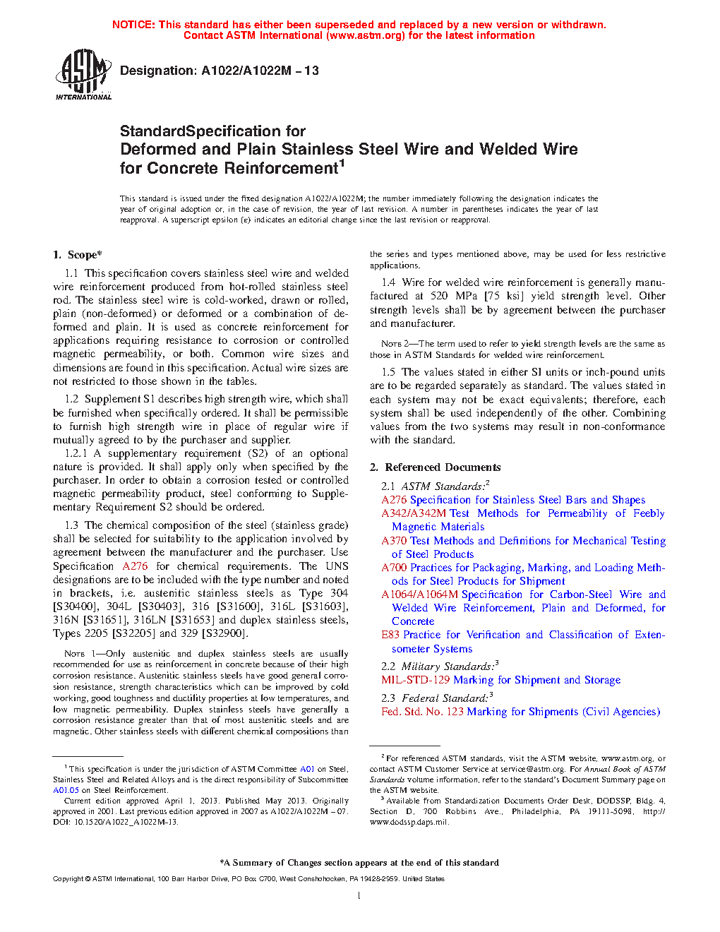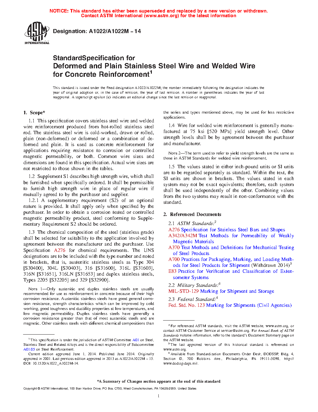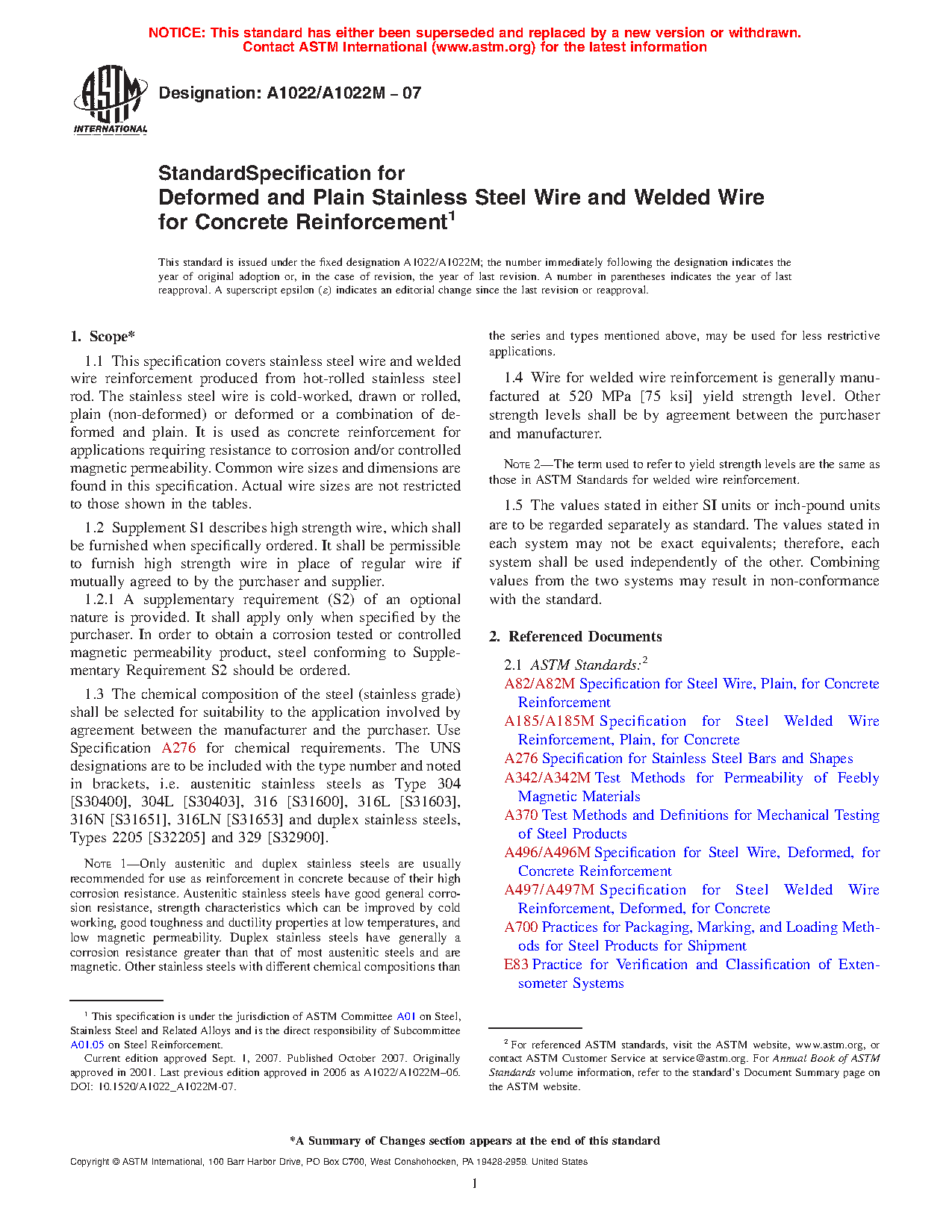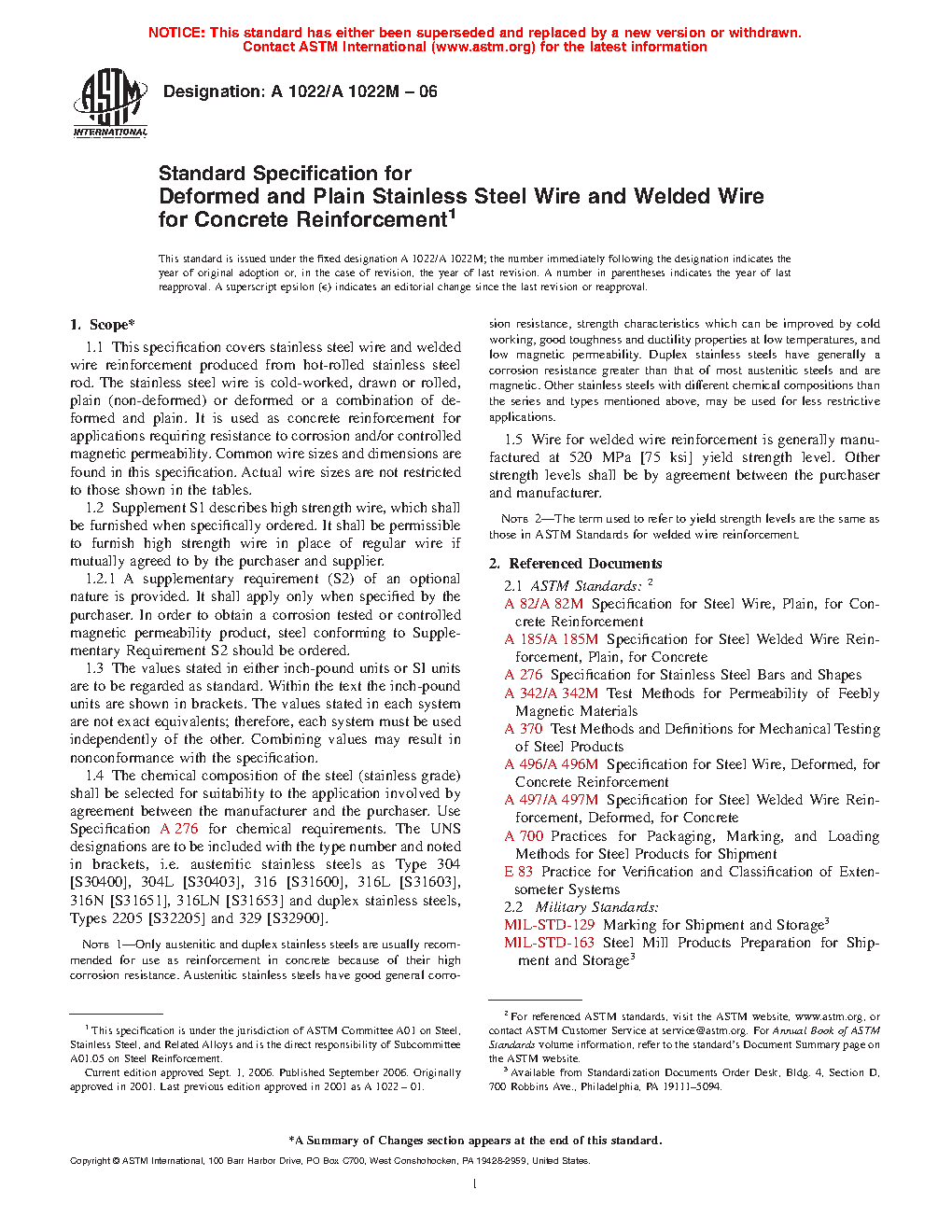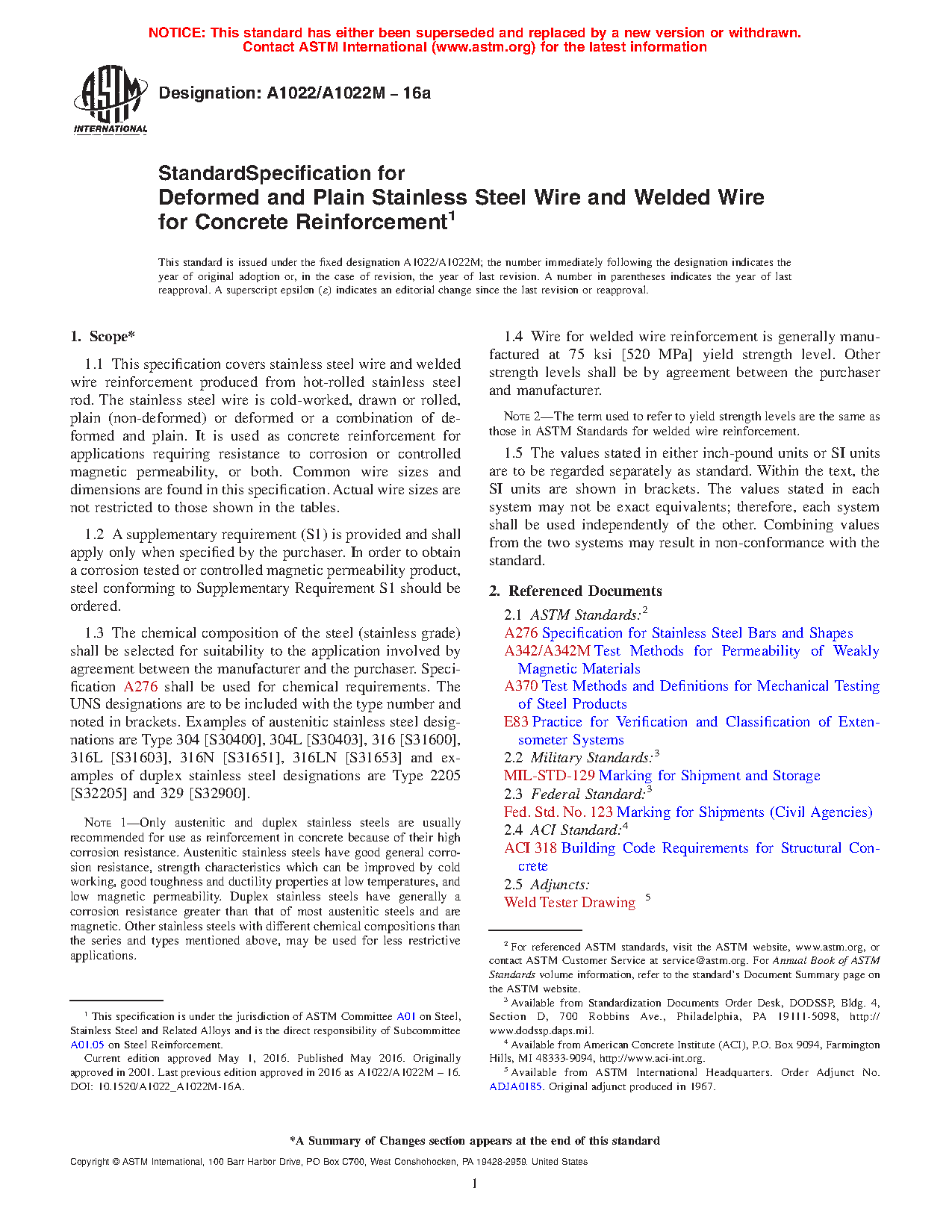 1.1 This specification covers stainless steel wire and welded wire reinforcement produced from hot-rolled stainless steel rod. The stainless steel wire is cold-worked, drawn or rolled, plain (non-deformed) or deformed or a combination of deformed and plain. It is used as concrete reinforcement for applications requiring resistance to corrosion or controlled magnetic permeability, or both. Common wire sizes and dimensions are found in this specification. Actual wire sizes are not restricted to those shown in the tables.