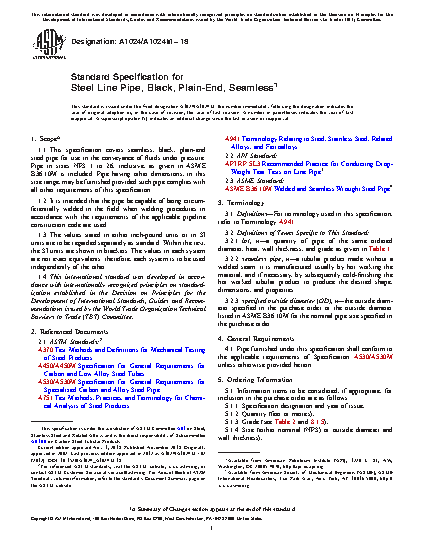 This specification covers standard requirements for seamless, black, plain-end steel pipes for use in the conveyance of fluids under pressure. A quantity of pipe of the same ordered diameter, heat, wall thickness, and grade shall be given. Heat and product analyses shall be performed wherein steel pipes shall conform to the required chemical composition for carbon, sulfur, and phosphorus. Steel samples shall undergo tension test and shall conform to tensile properties such as yield strength and tensile strength. Hydrostatic pressure test shall be performed for steel samples with specified wall thickness and test pressure. The entire outer surface of the steel pipe shall undergo nondestructive electric test and shall be inspected for longitudinal defects by either magnetic particle inspection, ultrasonic inspection, and electromagnetic inspection.