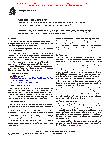 1.1 This test method describes procedures to determine the hydrogen embrittlement (HE) resistance of hard-drawn steel wire used for prestressed concrete pipe.
