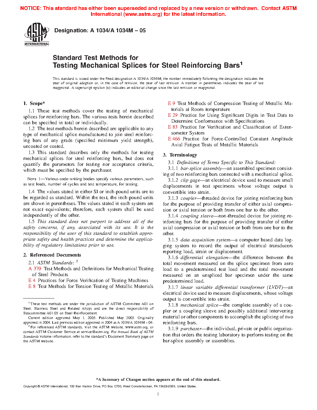 1.1 These test methods cover the testing of mechanical splices for reinforcing bars. The various tests herein described can be specified in total or individually.
