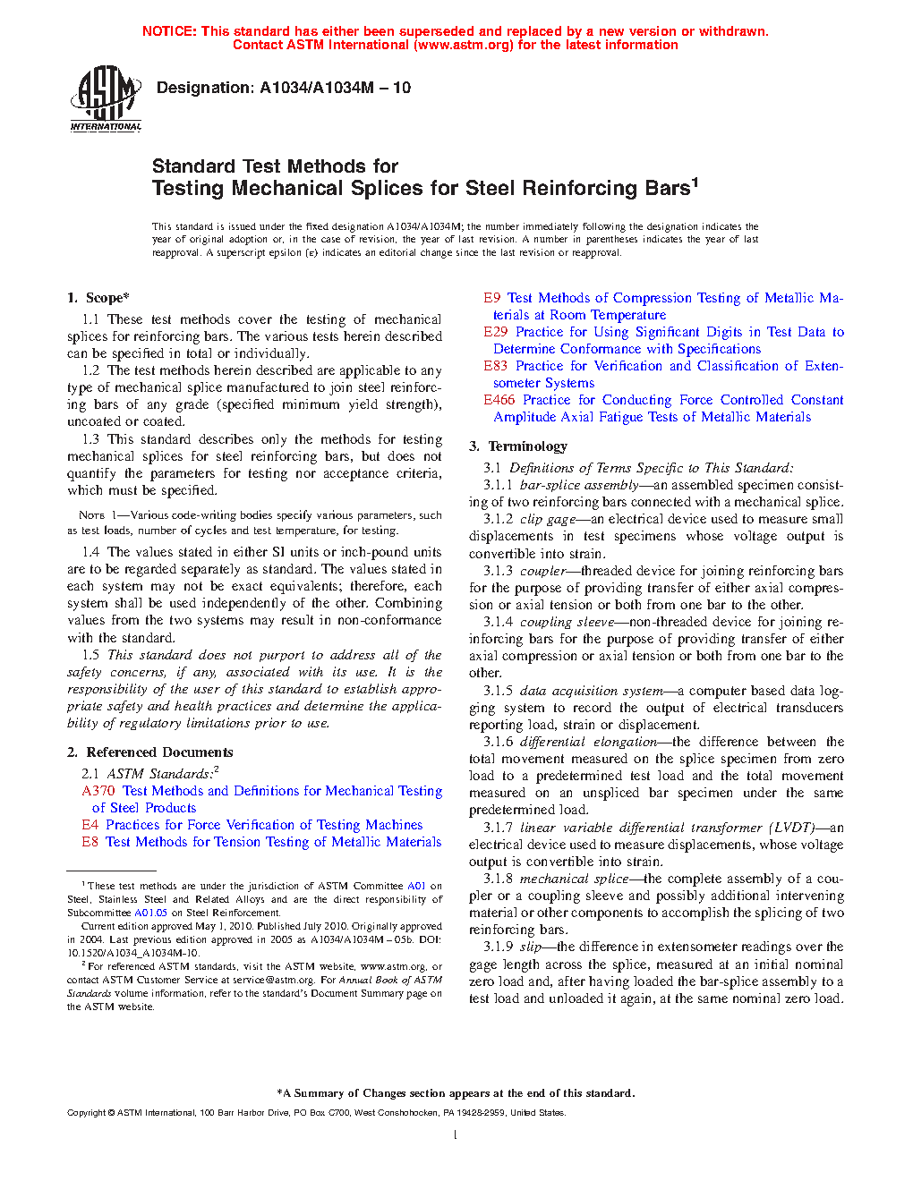 1.2 The test methods herein described are applicable to any type of mechanical splice manufactured to join steel reinforcing bars of any grade (specified minimum yield strength), uncoated or coated.