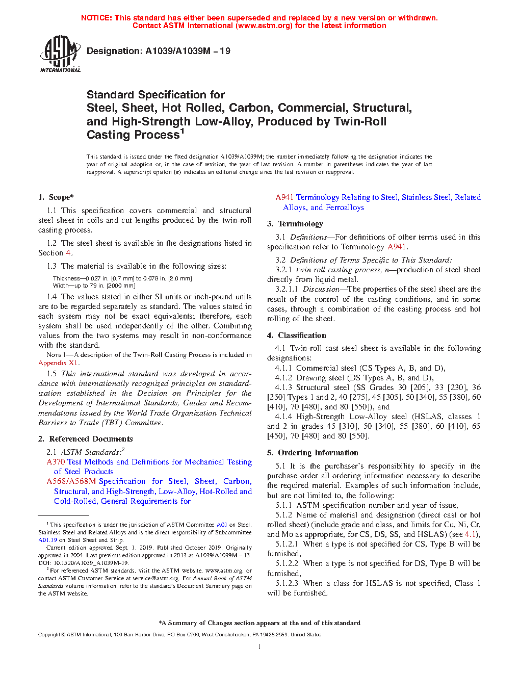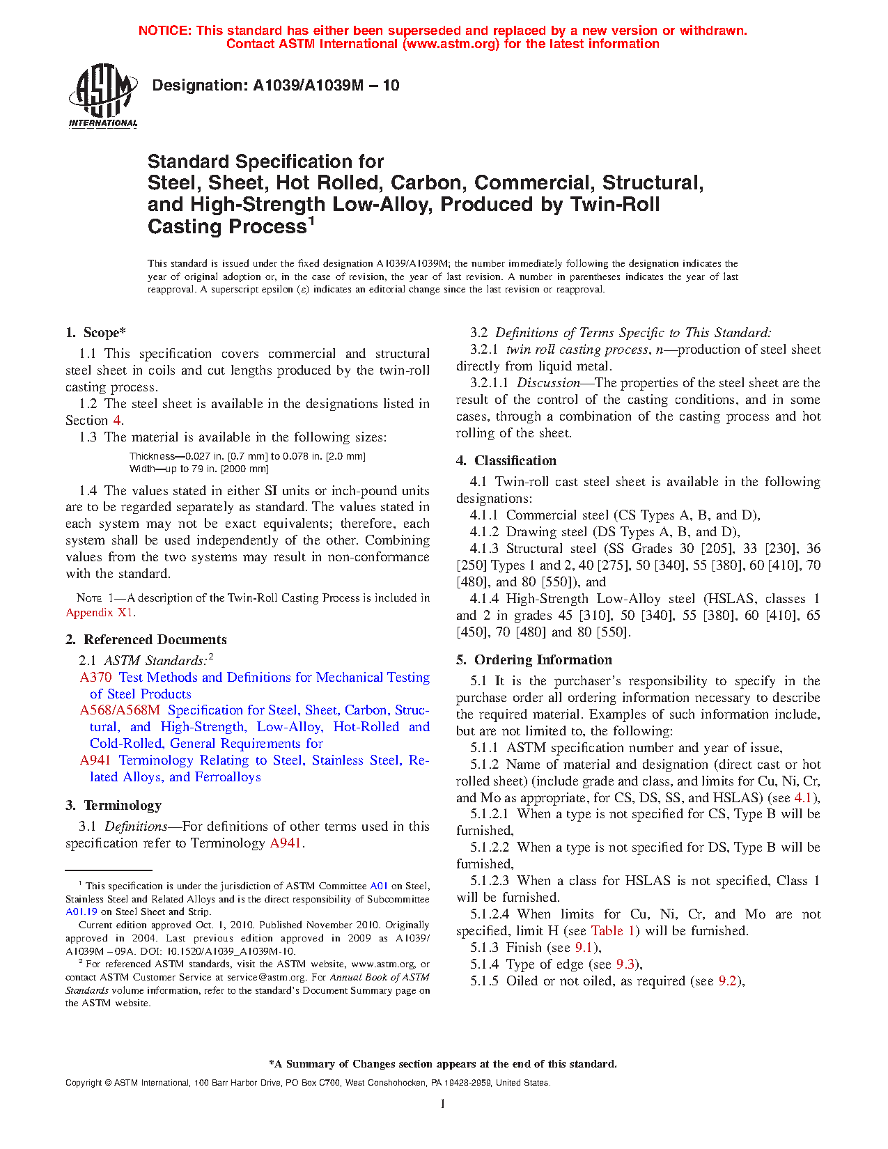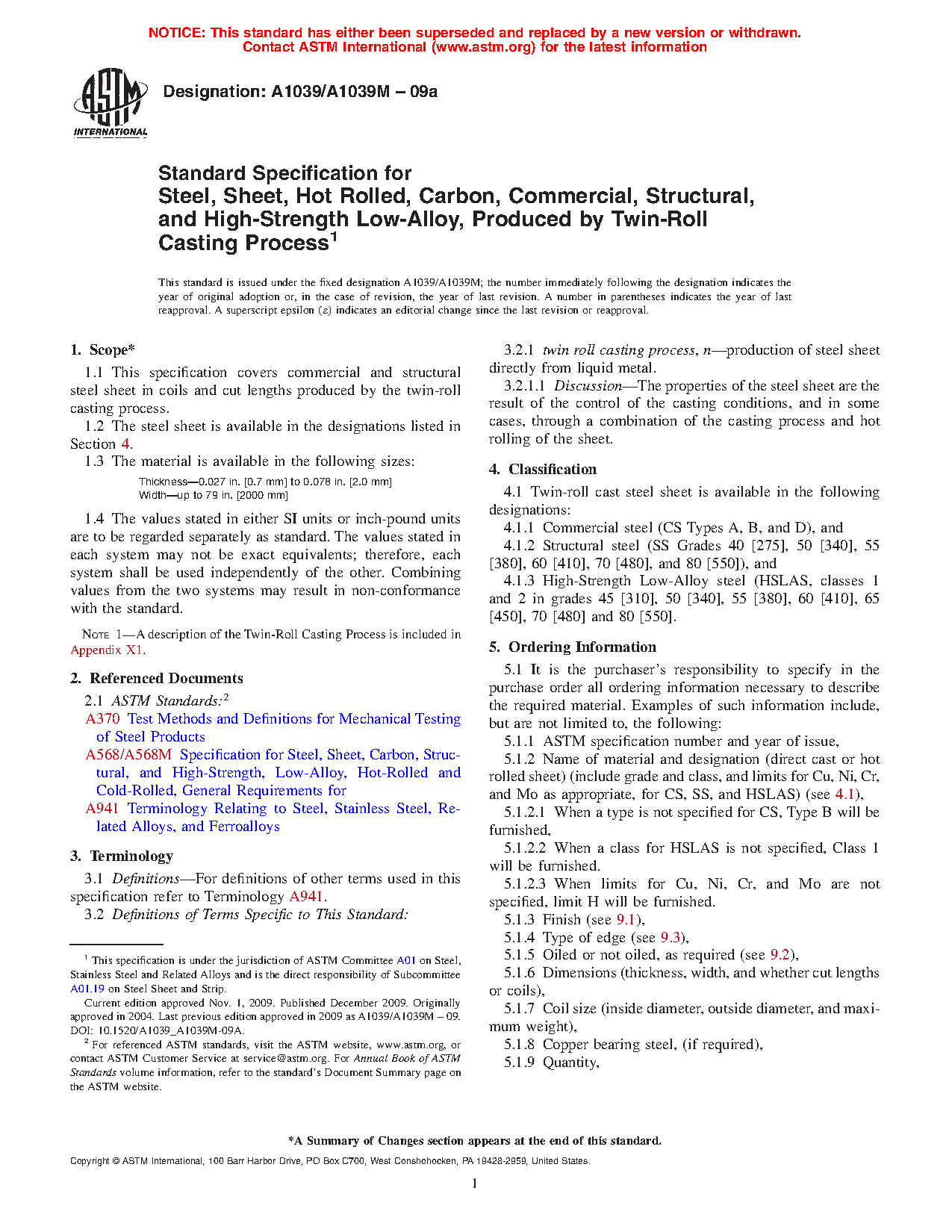 1.1 This specification covers commercial, structural, high-strength low-alloy, and ultra-high strength steel sheet in coils and cut lengths produced by the twin-roll casting process.