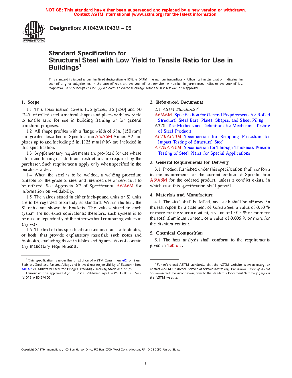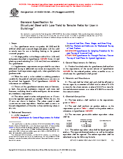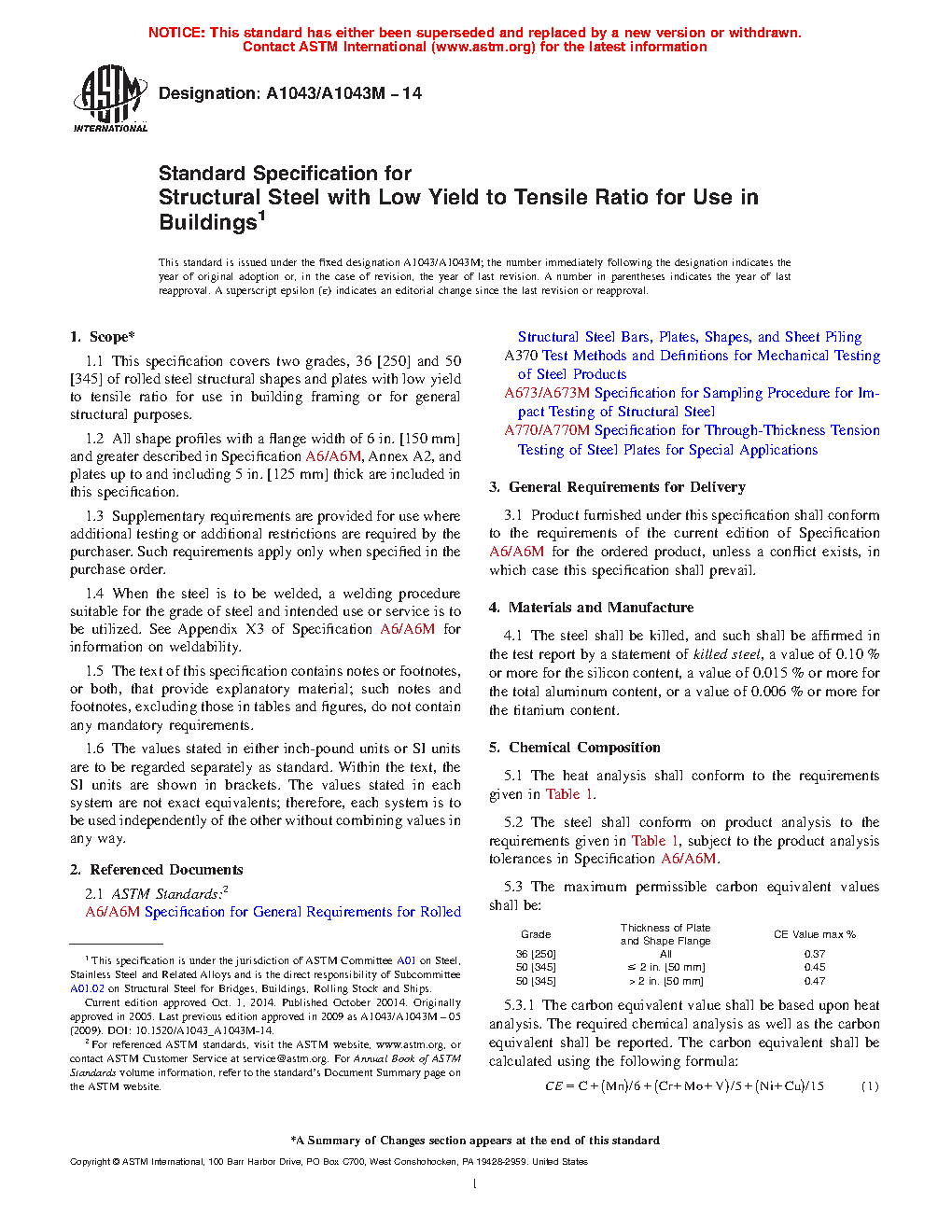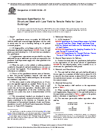 1.1 This specification covers two grades, 36 [250] and 50 [345] of rolled steel structural shapes and plates with low yield to tensile ratio for use in building framing or for general structural purposes.