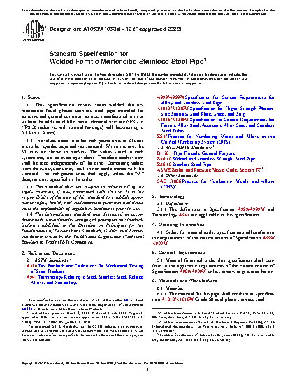 This specification covers seam welded ferritic-martensitic stainless steel pipe intended for abrasive and general corrosion service. The pipes are classified according to sizes, from NPS 2 to NPS 36. The pipe shall be made using Electric Resistance Welding (ERW) or an automatic fusion welding process with no addition of filler metal during the welding process. All pipes shall be made from heat treated strip or plate, cold formed and welded. Tensile test, flattening test, hydrostatic test, and nondestructive electric test shall be made in accordance with the pipe specification to conform to the requirements specified.