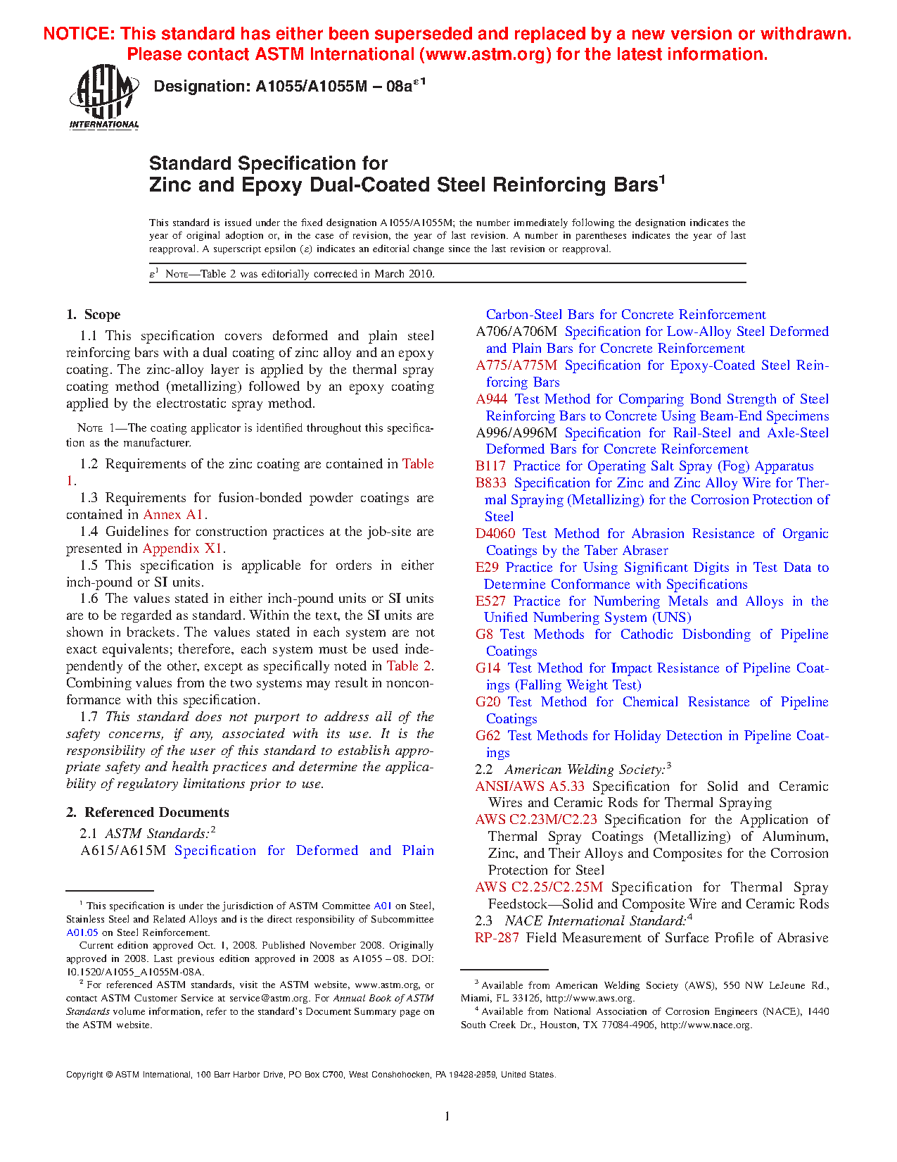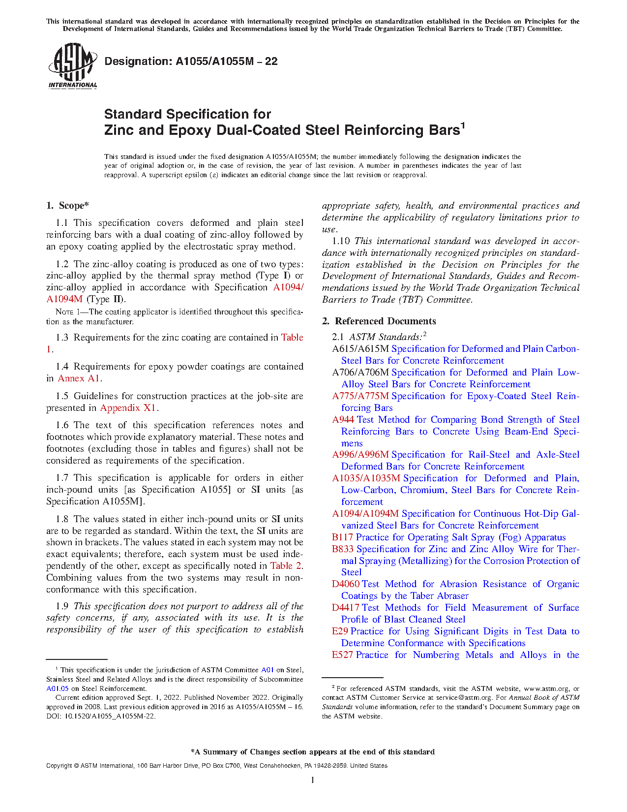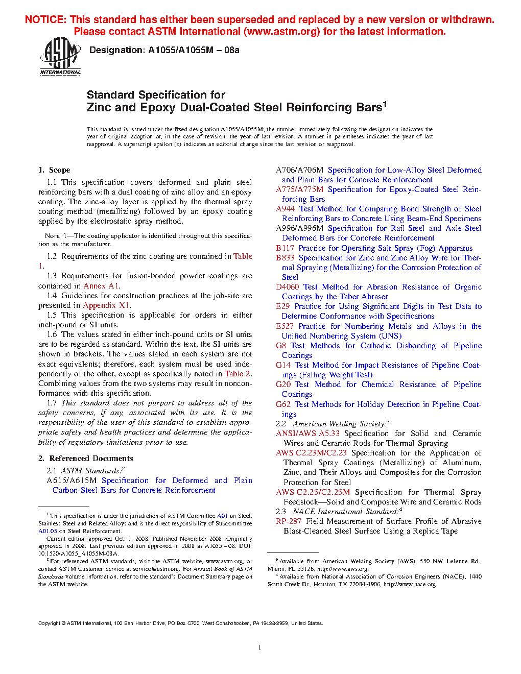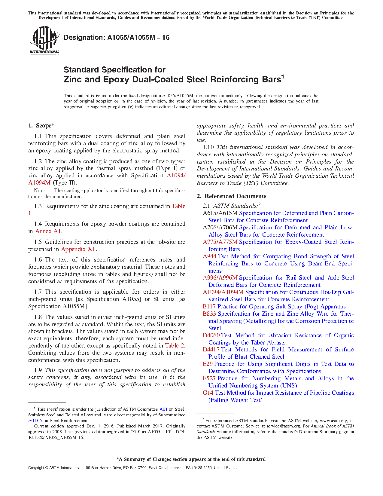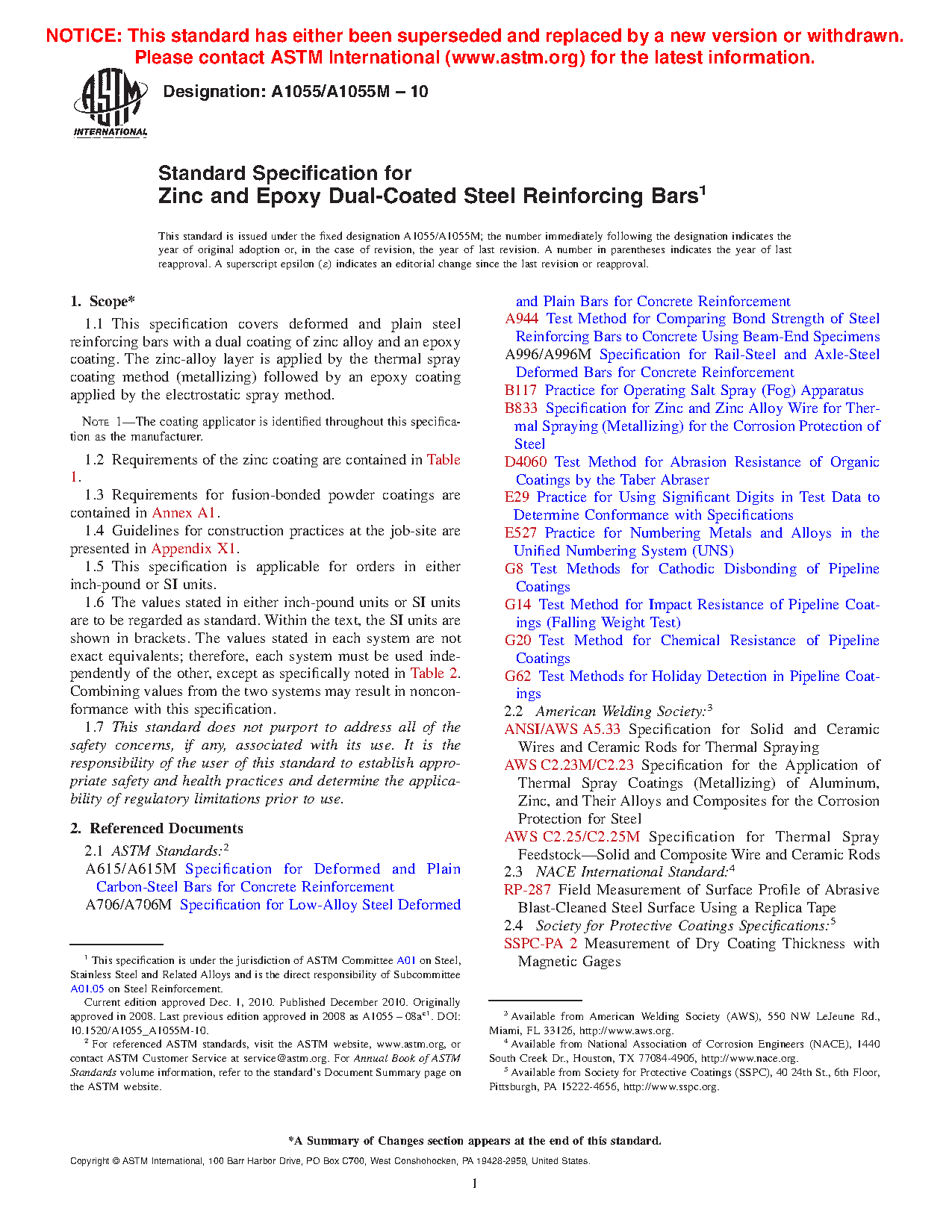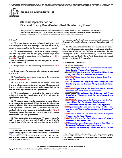 1.1 This specification covers deformed and plain steel reinforcing bars with a dual coating of zinc-alloy followed by an epoxy coating applied by the electrostatic spray method.