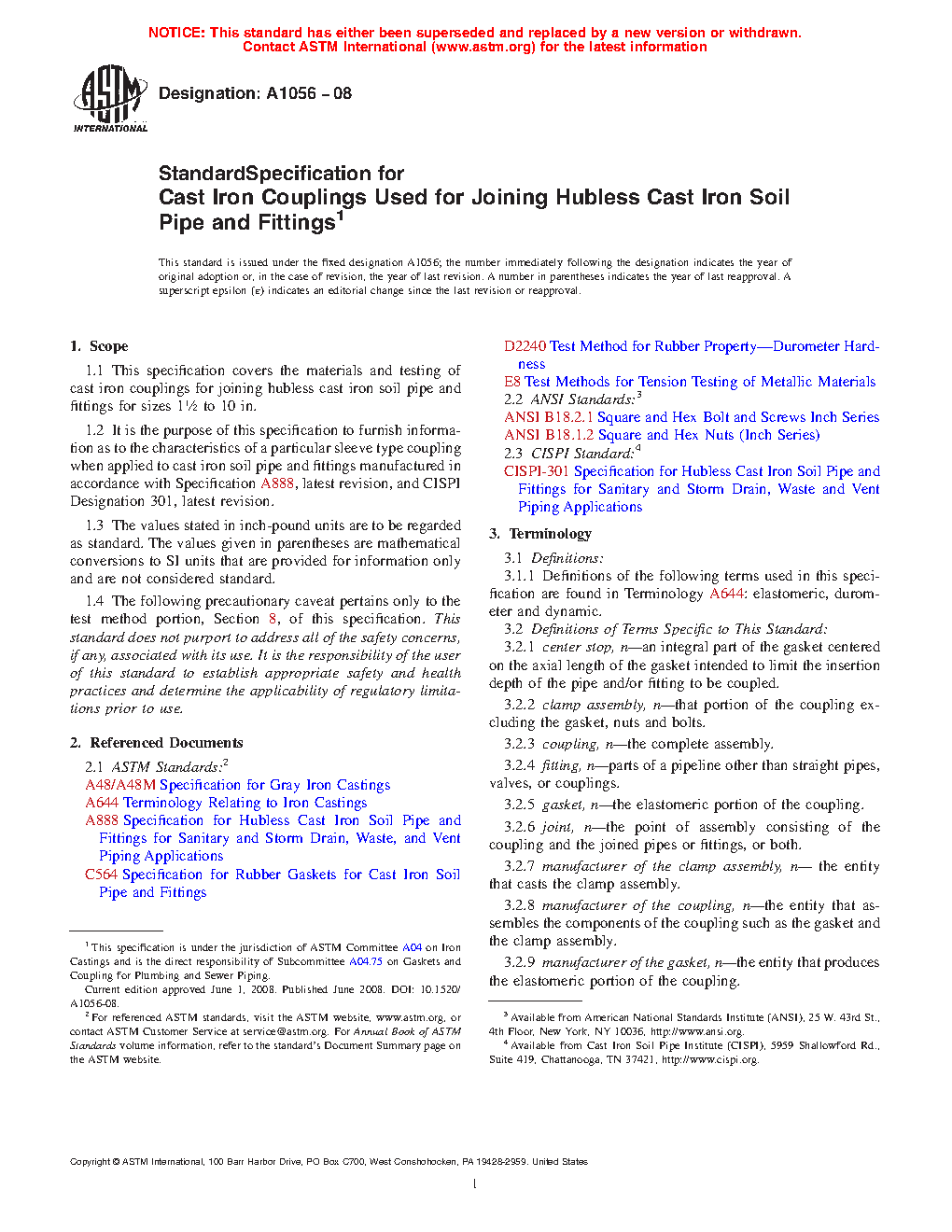 1.2 It is the purpose of this specification to furnish information as to the characteristics of a particular sleeve type coupling when applied to cast iron soil pipe and fittings manufactured in accordance with Specification A888, latest revision, and CISPI Designation 301, latest revision.