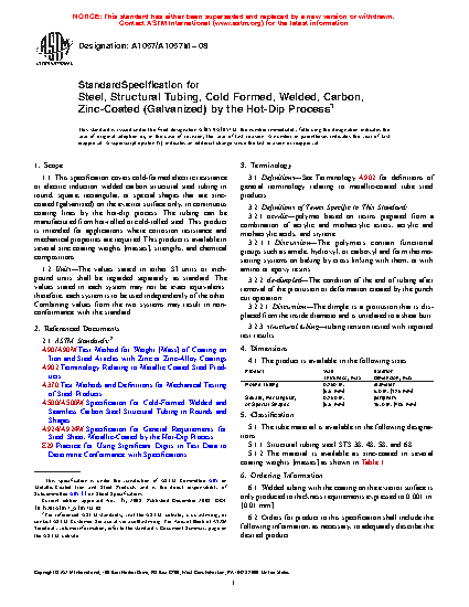 1.1 This specification covers cold-formed electric resistance or electric induction welded carbon structural steel tubing in round, square, rectangular, or special shapes that are zinc-coated (galvanized) on the exterior surface only, in continuous coating lines by the hot-dip process. The tubing can be manufactured from hot-rolled or cold-rolled steel. This product is intended for applications where corrosion resistance and mechanical properties are required. This product is available in several zinc coating weights [masses], strengths, and chemical compositions.