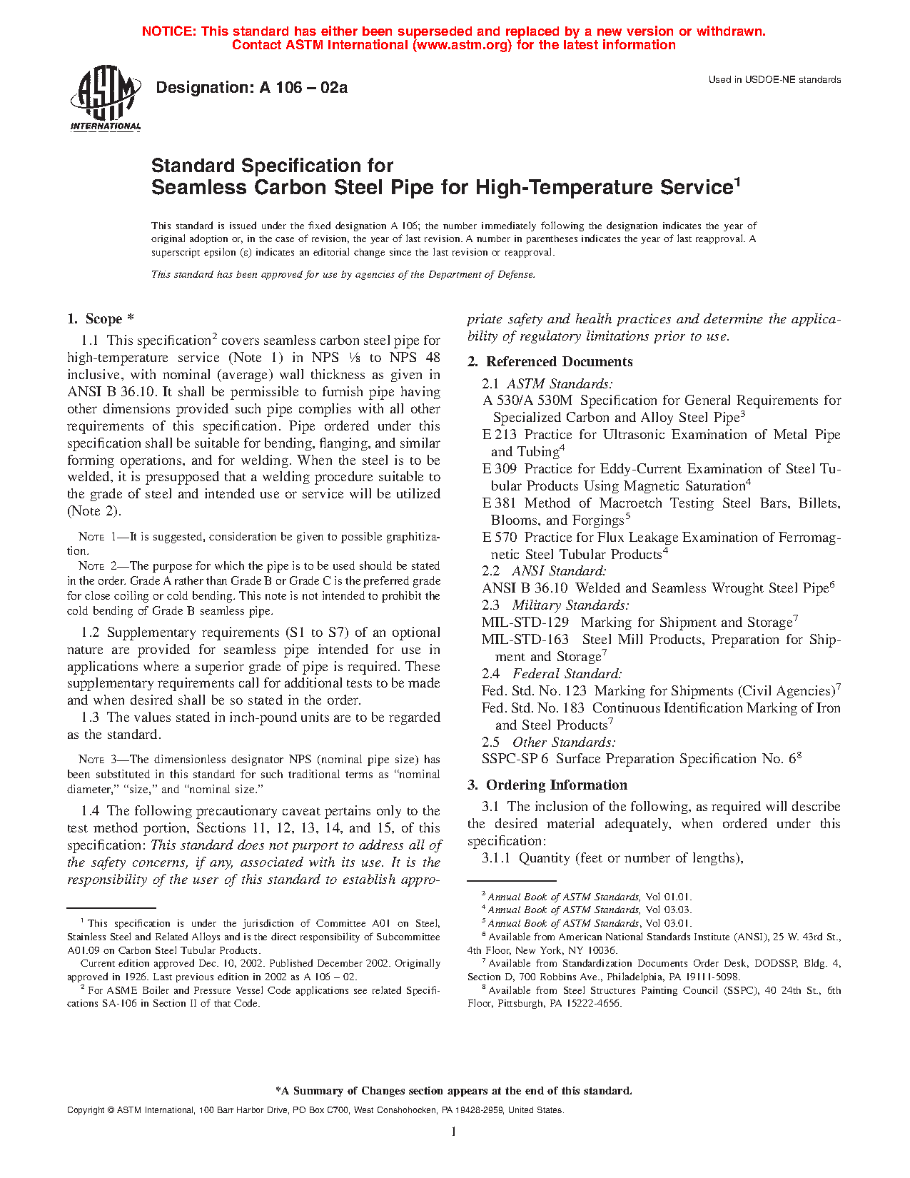 1.1 This specification covers seamless carbon steel pipe for high-temperature service (Note 0) in NPS 1/8 to NPS 48 [DN 6 to DN 1200] inclusive, with nominal (average) wall thickness as given in ASME B 36.10M. It shall be permissible to furnish pipe having other dimensions provided such pipe complies with all other requirements of this specification. Pipe ordered under this specification shall be suitable for bending, flanging, and similar forming operations, and for welding. When the steel is to be welded, it is presupposed that a welding procedure suitable to the grade of steel and intended use or service will be utilized.