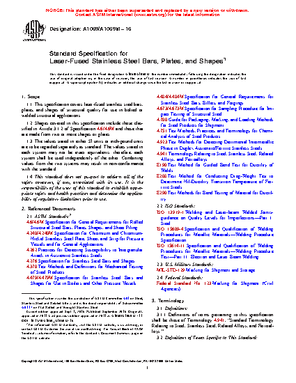 This specification covers laser-fused stainless steel bars, plates, and shapes of structural quality for use in bolted or welded structural applications. The butt-welded test pieces are welded using laser fusion and then machined into tensile test bars and root-bend test specimens. The term laser fusion is used in this specification to refer to a joining process that is able to produce a coalescence of material using the heat obtained from the application of a concentrated coherent light beam impinging on the surface of a weld joint.