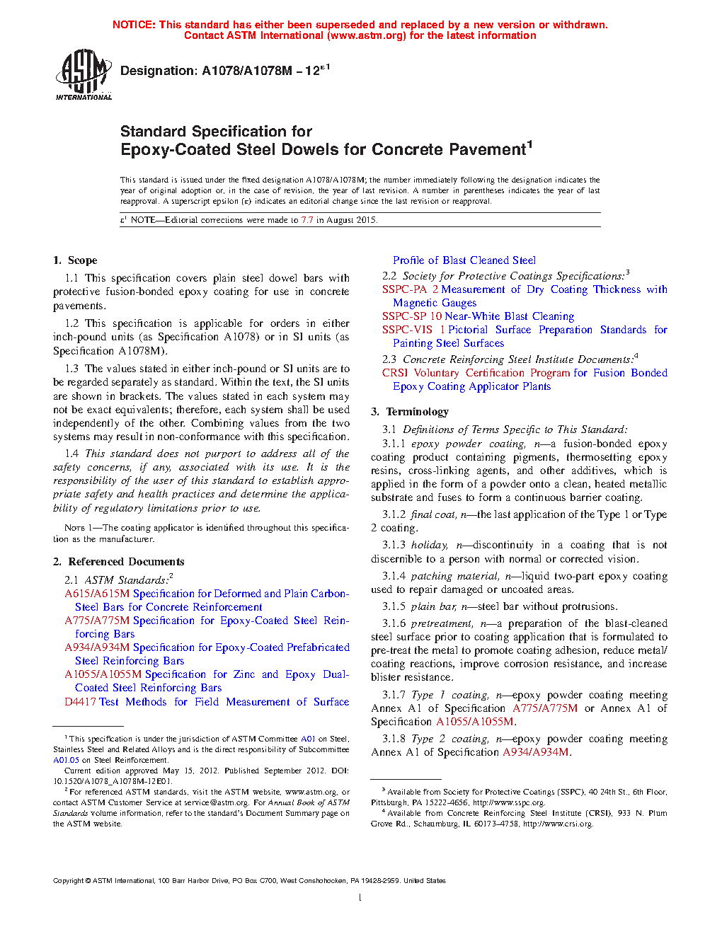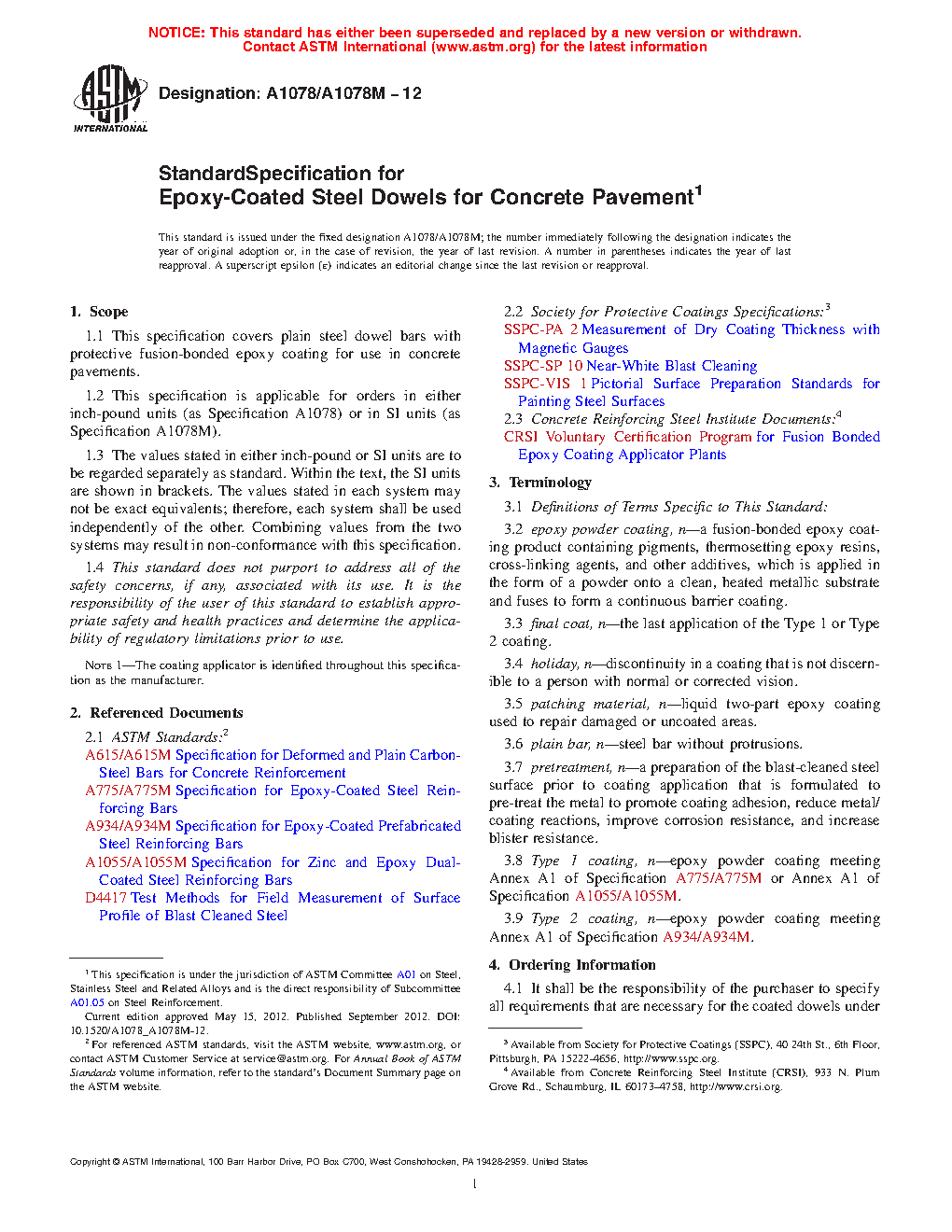 1.1 This specification covers plain steel dowel bars with protective fusion-bonded epoxy coating for use in concrete pavements.