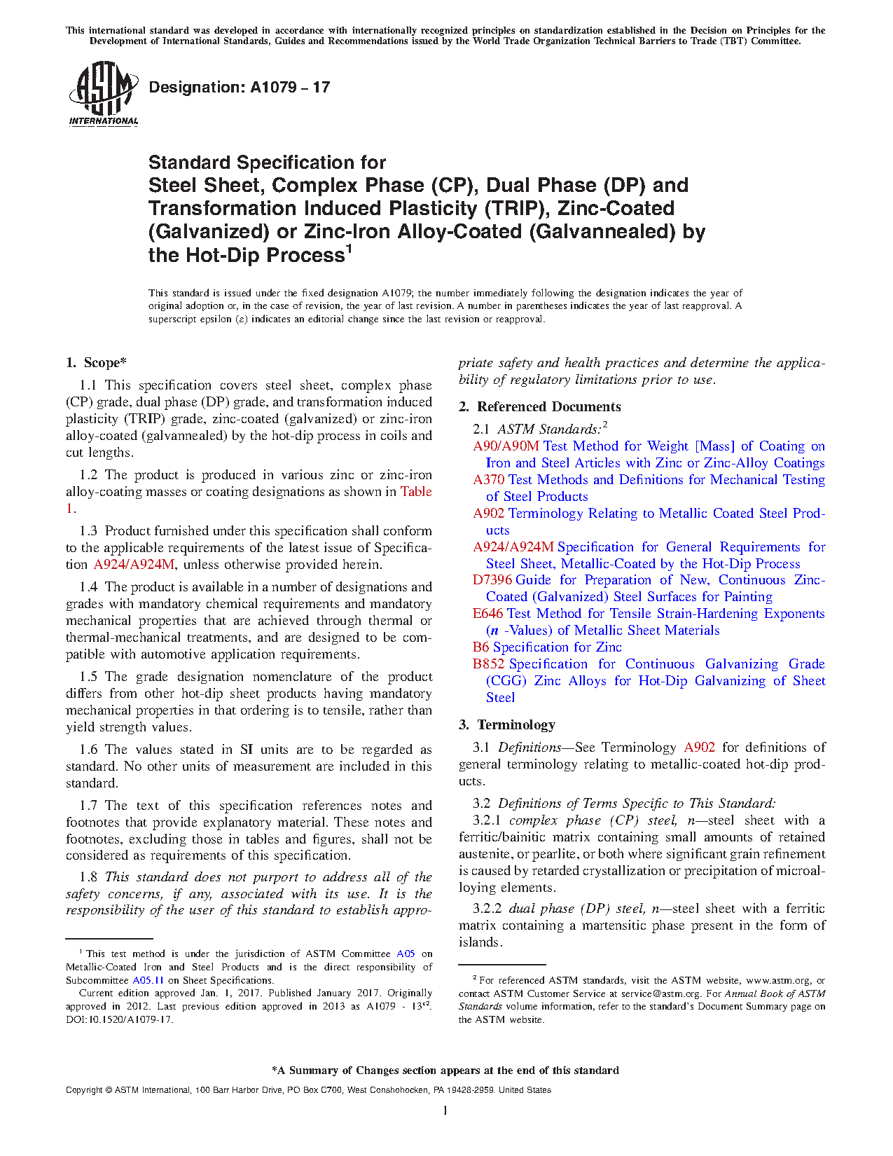 1.1 This specification covers steel sheet, complex phase (CP) grade, dual phase (DP) grade, and transformation induced plasticity (TRIP) grade, zinc-coated (galvanized) or zinc-iron alloy-coated (galvannealed) by the hot-dip process in coils and cut lengths.