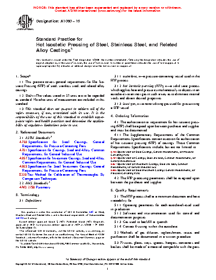 1.1 This practice covers general requirements for hot isostatic pressing (HIP) of steel, stainless steel, and related alloy castings.