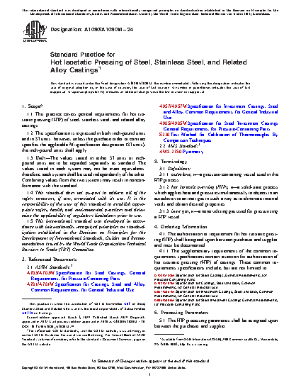 1.1 This practice covers general requirements for hot isostatic pressing (HIP) of steel, stainless steel, and related alloy castings.
