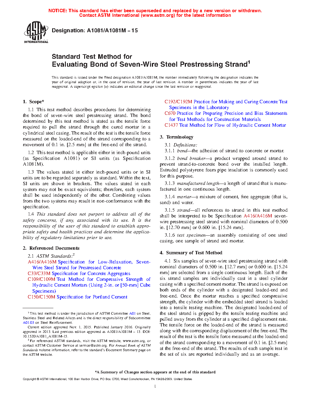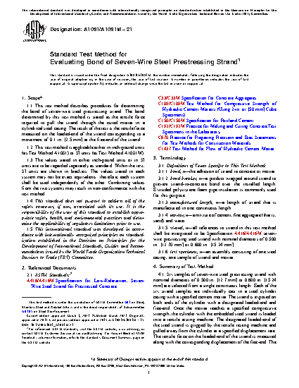 1.1 This test method describes procedures for determining the bond of seven-wire steel prestressing strand. The bond determined by this test method is stated as the tensile force required to pull the strand through the cured mortar in a cylindrical steel casing. The result of the test is the tensile force measured on the loaded-end of the strand corresponding to a movement of 0.1 in. [2.5 mm] at the free-end of the strand.