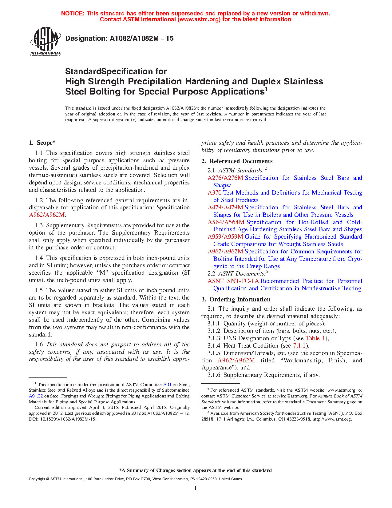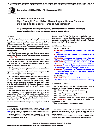 This specification covers high strength stainless steel bolting for special purpose applications such as pressure vessels. Several grades of precipitation-hardened and duplex (ferritic-austenitic) stainless steels are covered. Selection will depend upon design, service conditions, mechanical properties and characteristics related to the application. Bolting supplied to this specification shall conform to the requirements of Specification A962/A962M. These requirements include test methods, finish, thread dimensions, marking, terminology, testing, certification, optional supplementary requirements, and others. Bars shall be produced in accordance with Specifications A276/A276M, A479/A479M or A564/A564M as applicable while the fasteners shall be produced in accordance with this specification and the requirements of A962/A962M.