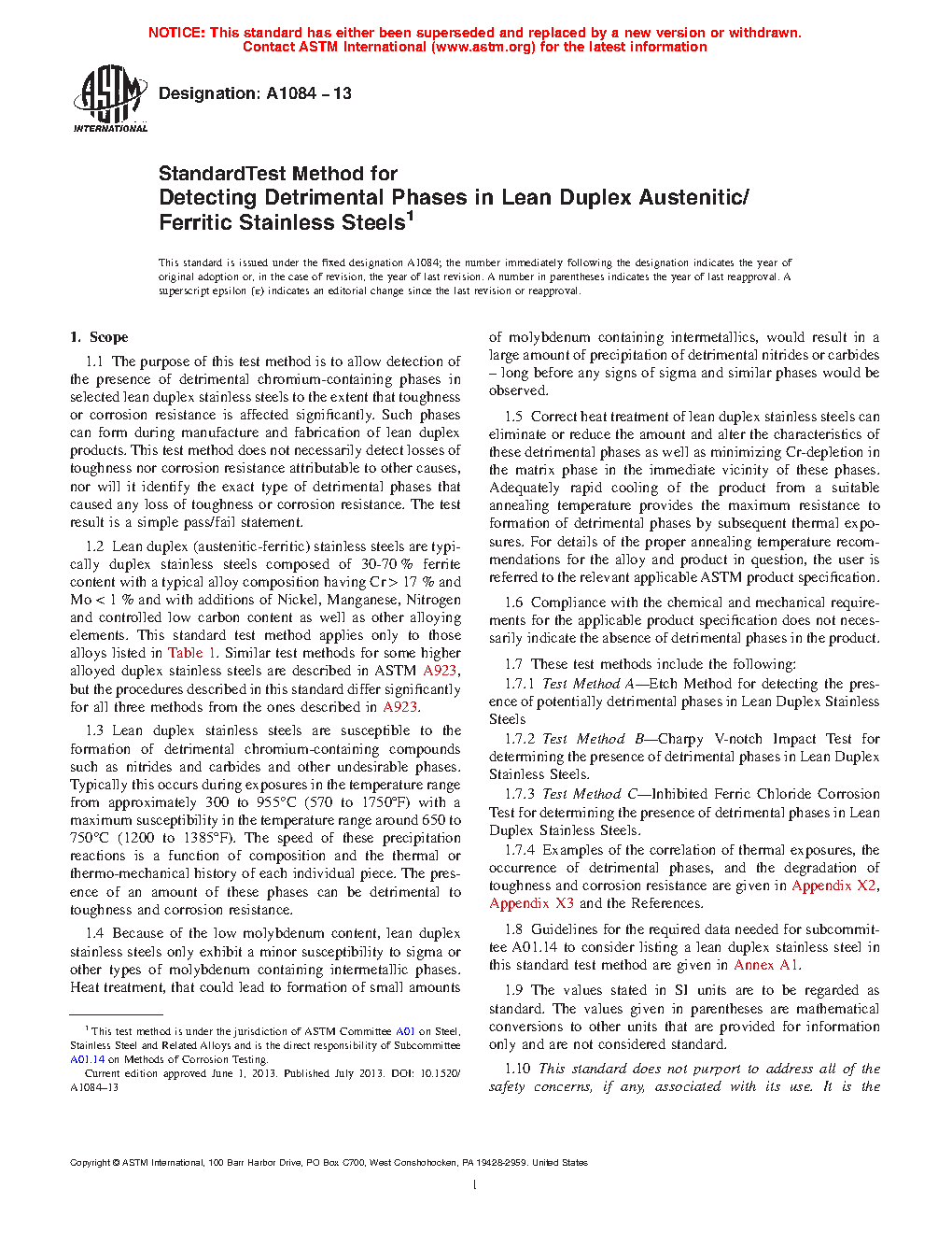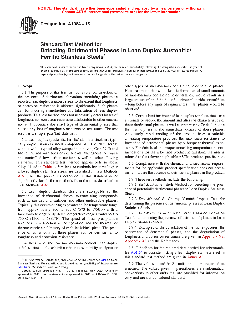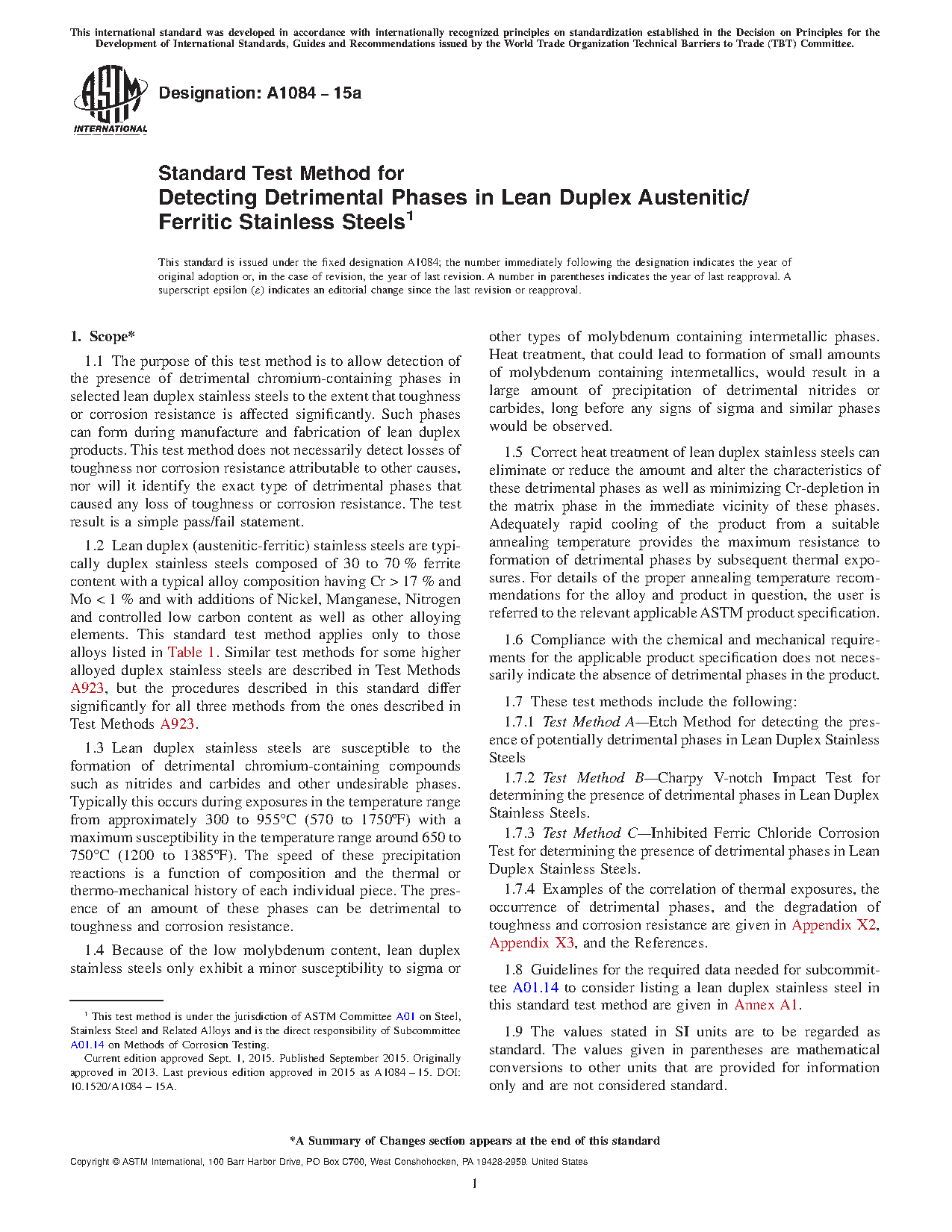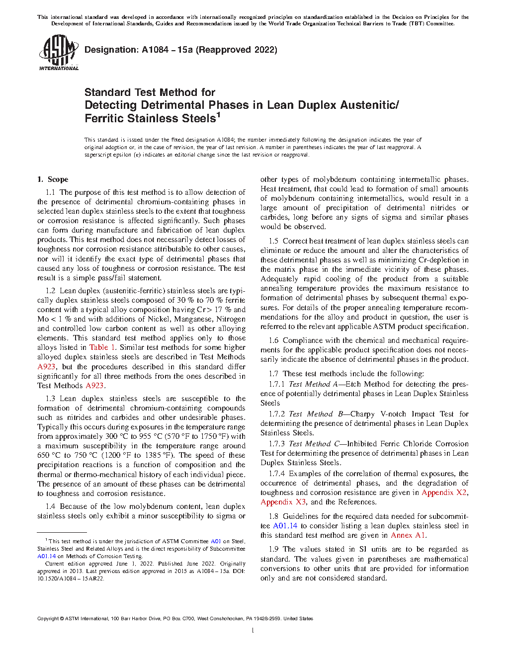1.1 The purpose of this test method is to allow detection of the presence of detrimental chromium-containing phases in selected lean duplex stainless steels to the extent that toughness or corrosion resistance is affected significantly. Such phases can form during manufacture and fabrication of lean duplex products. This test method does not necessarily detect losses of toughness nor corrosion resistance attributable to other causes, nor will it identify the exact type of detrimental phases that caused any loss of toughness or corrosion resistance. The test result is a simple pass/fail statement.