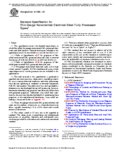 1.1 This specification covers the detailed requirements to which flat-rolled thin-gauge nonoriented fully processed electrical steel shall conform. Nominal thicknesses included in this specification are 0.10 mm (0.004 in.) to 0.30 mm (0.012 in.).
