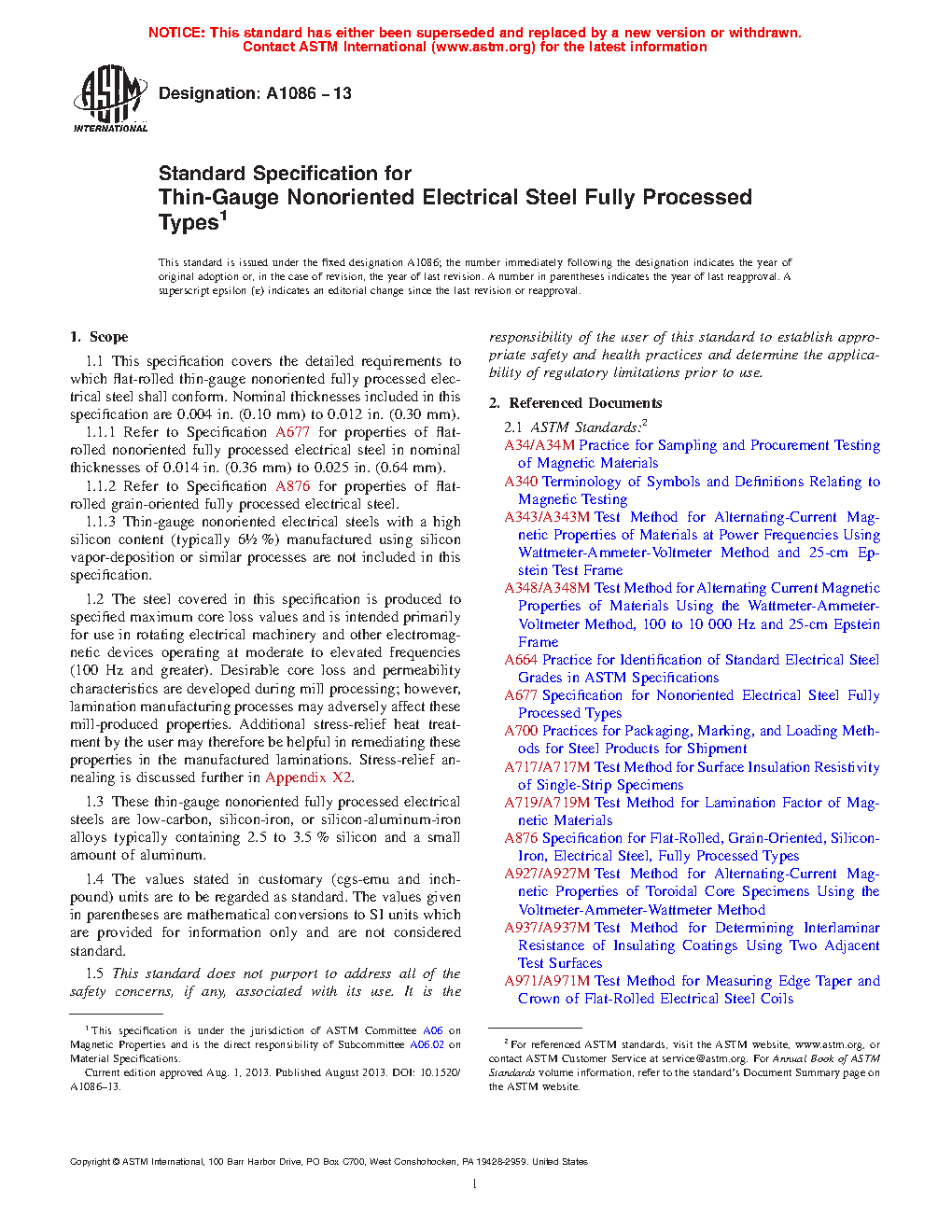 1.1.1 Refer to Specification A677 for properties of flat-rolled nonoriented fully processed electrical steel in nominal thicknesses of 0.36 mm (0.014 in.) to 0.64 mm (0.025 in.).