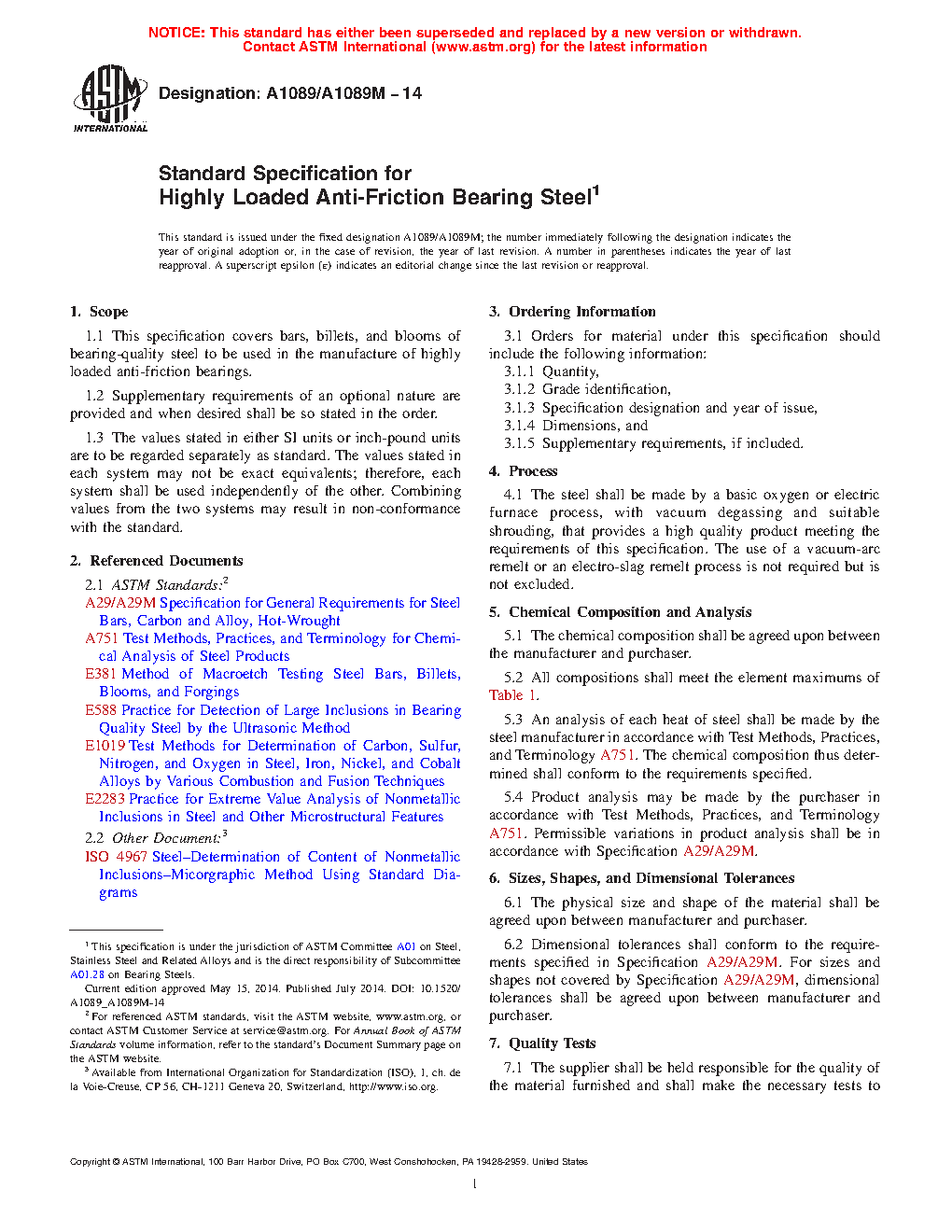 1.1 This specification covers bars, billets, and blooms of bearing-quality steel to be used in the manufacture of highly loaded anti-friction bearings.
