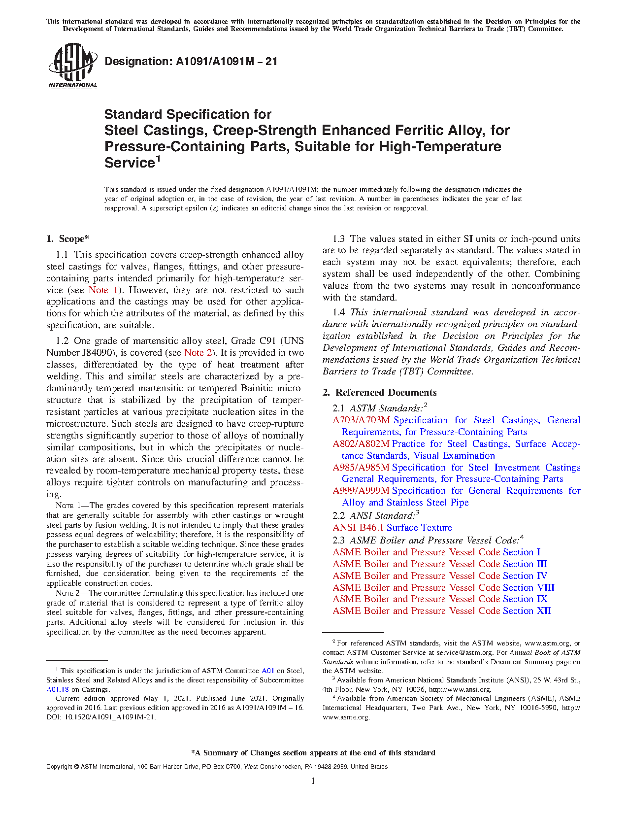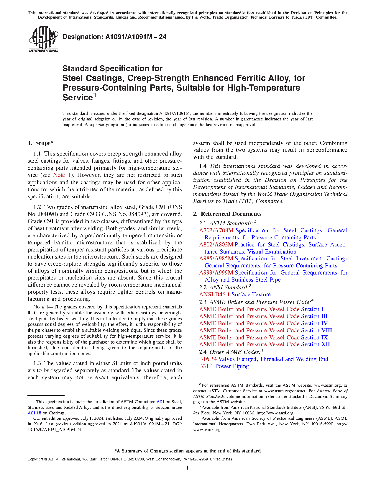 1.1 This specification covers creep-strength enhanced alloy steel castings for valves, flanges, fittings, and other pressure-containing parts intended primarily for high-temperature service (see Note 1). However, they are not restricted to such applications, and the castings may be used for other applications for which the attributes of the material, as defined by this specification, are suitable.