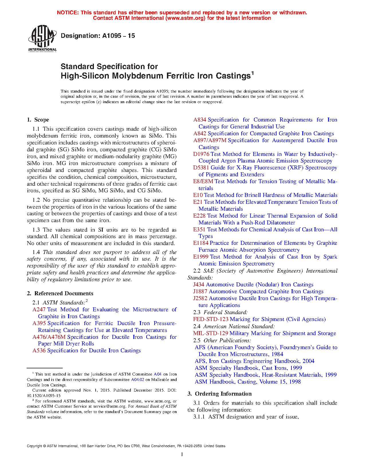 This specification covers: ordering information (including grade of silicon-molybdenum ferritic iron required, chemical composition requirements, microstructure and mechanical requirements, and special preparation for delivery); material, structural performance, and manufacturing practice; mechanical and chemical composition; workmanship, finish, and appearance; inspection and quality; certification; product marking; and packaging and package marking.