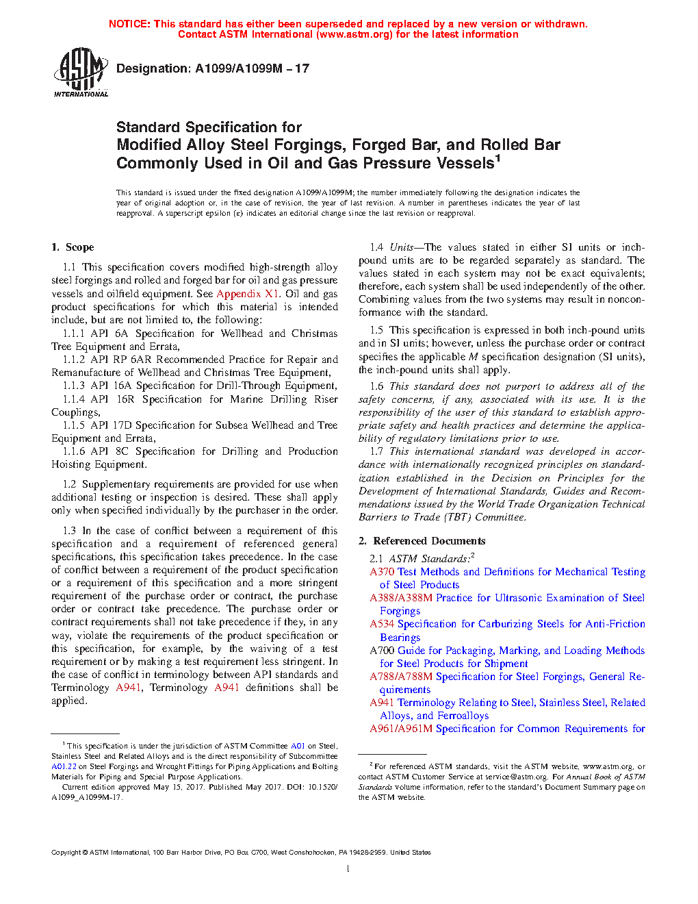 1.1 This specification covers modified high-strength alloy steel forgings and rolled and forged bar for oil and gas pressure vessels and oilfield equipment. See Appendix X1. Oil and gas product specifications for which this material is intended include, but are not limited to, the following: