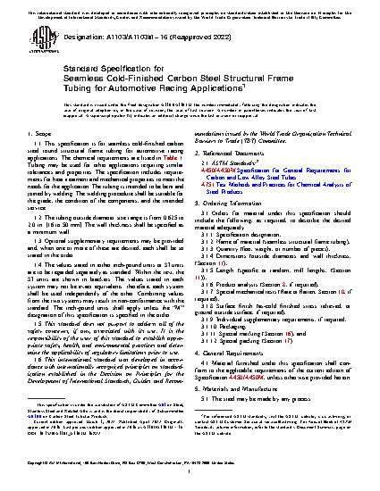1.1 This specification is for seamless cold-finished carbon steel round structural frame tubing for automotive racing applications. The chemical requirements are listed in Table 1. Tubing may be used for other applications requiring similar tolerances and properties. The specification includes requirements for heat treatment and mechanical properties to meet the needs for the application. The tubing is intended to be bent and joined by welding. The welding procedure shall be suitable for the grade, the condition of the components, and the intended service.