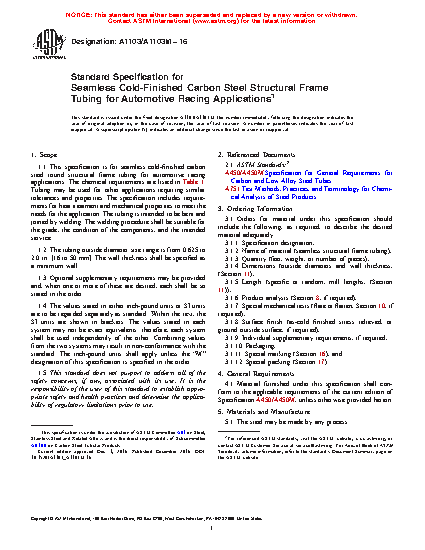 This specification covers seamless cold-finished carbon steel round structural frame tubing for automotive racing applications. Tubing may be used for other applications requiring similar tolerances and properties. The tubing is intended to be bent and joined by welding. The welding procedure shall be suitable for the grade, the condition of the components, and the intended service.