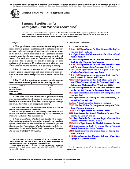 1.1 This specification covers the manufacture and purchase requirements of products used for assembly and construction of circular reinforced corrugated steel manholes used in sewer and water works. Products covered by this specification are not normally used for the conveyance of sanitary or industrial wastes. The steel sheet used in fabrication of the manhole structures has a protective metallic coating of zinc (galvanizing), aluminum, 55 % aluminum-zinc alloy, or zinc-5 % aluminum-mischmetal alloy, or a polymer pre-coating.