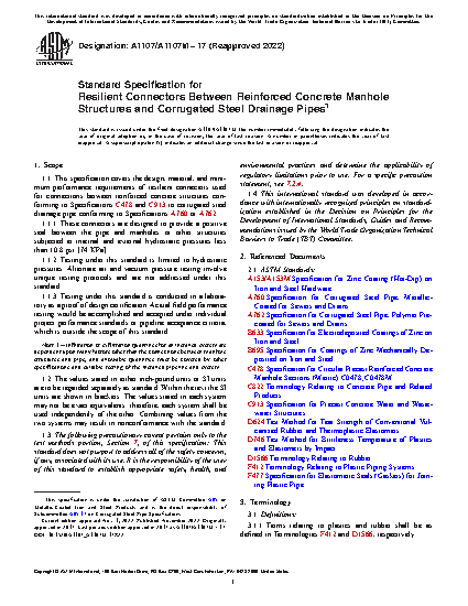 1.1 This specification covers the design, material, and minimum performance requirements of resilient connectors used for connections between reinforced concrete structures conforming to Specifications C478 and C913 to corrugated steel drainage pipe conforming to Specifications A760 or A762.