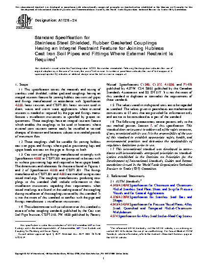 1.1 This specification covers the materials and testing of stainless steel shielded, rubber gasketed couplings having an integral restraint feature for joining hubless cast iron soil pipes and fittings manufactured in accordance with Specification A888, latest revision, and CISPI 301, latest revision used in drain, waste, and storm water applications where external restraint is needed or required by the pipe and fittings manufacturer’s installation instructions or specified by project requirements. These couplings have an integral restraint feature which enables the couplings to be used in locations where external joint restraint cannot easily be installed at vertical changes of direction and locations subject to extended periods of maximum flow.