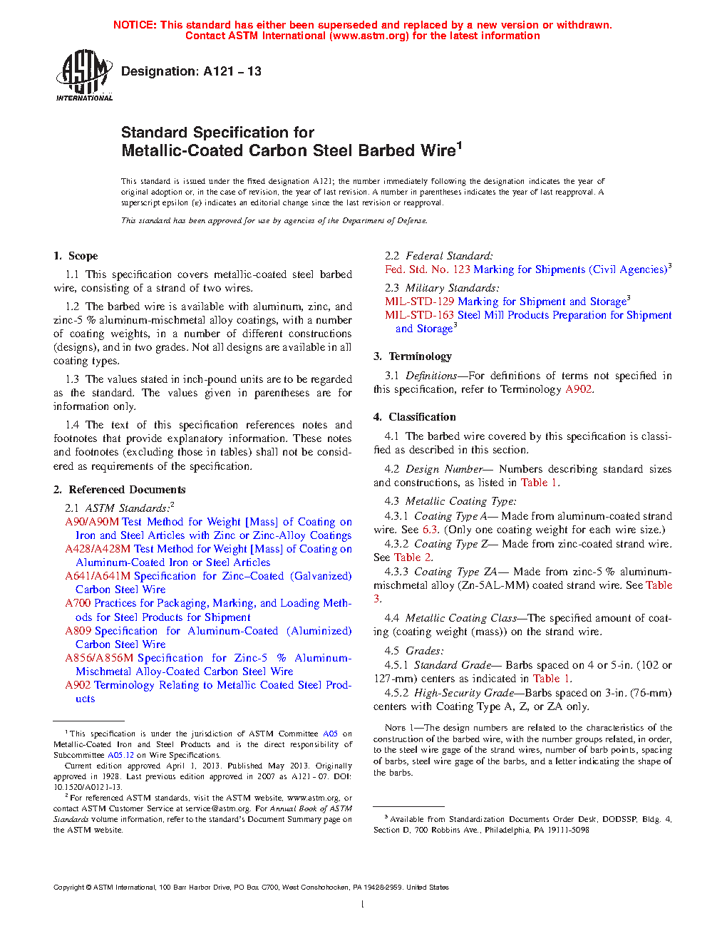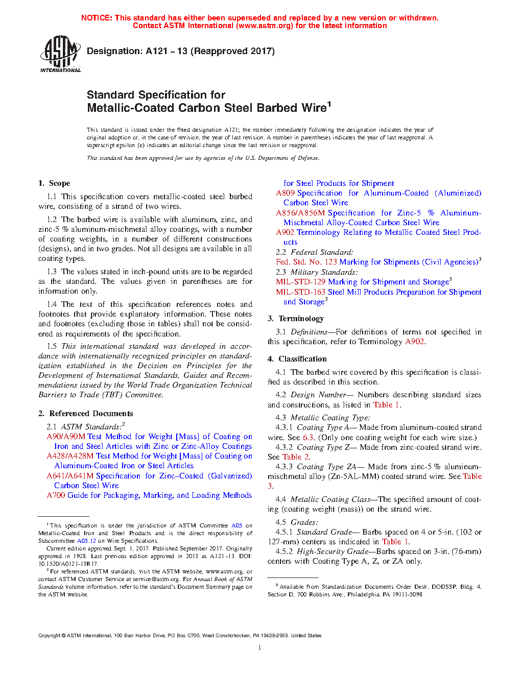 1.2 The barbed wire is available with aluminum, zinc, and zinc-5 % aluminum-mischmetal alloy coatings, with a number of coating weights, in a number of different constructions (designs), and in two grades. Not all designs are available in all coating types.