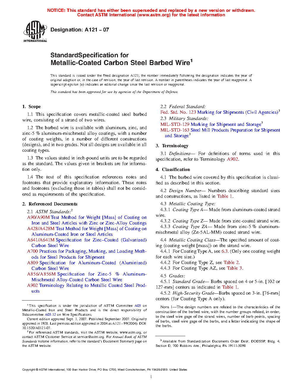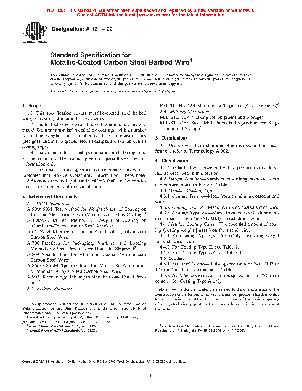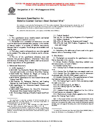 This specification covers metallic-coated carbon steel barbed wire, consisting of a strand of two wires. The barbed wire is available with aluminum, zinc, and zinc-aluminum-mismatched alloy coatings with a number of coating weights. The barbed wire is classified as coating Type A, Type Z, and Type ZA. The sizes and constructions for barbed wire furnished under this specification shall conform the requirements. Sampling, testing and inspection of the material shall be performed in accordance with this specification.