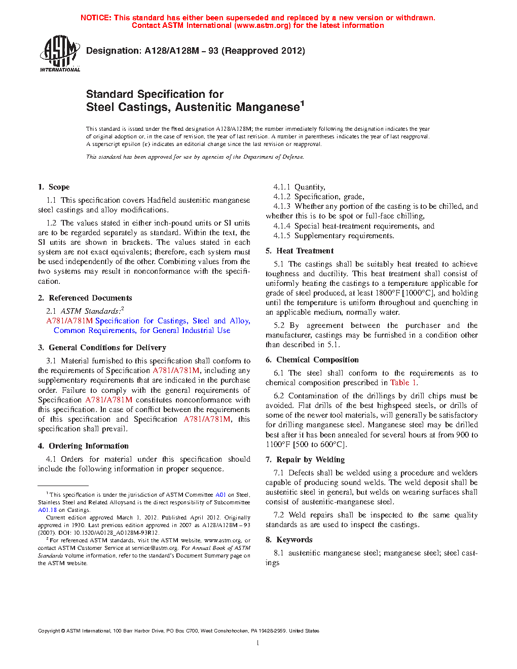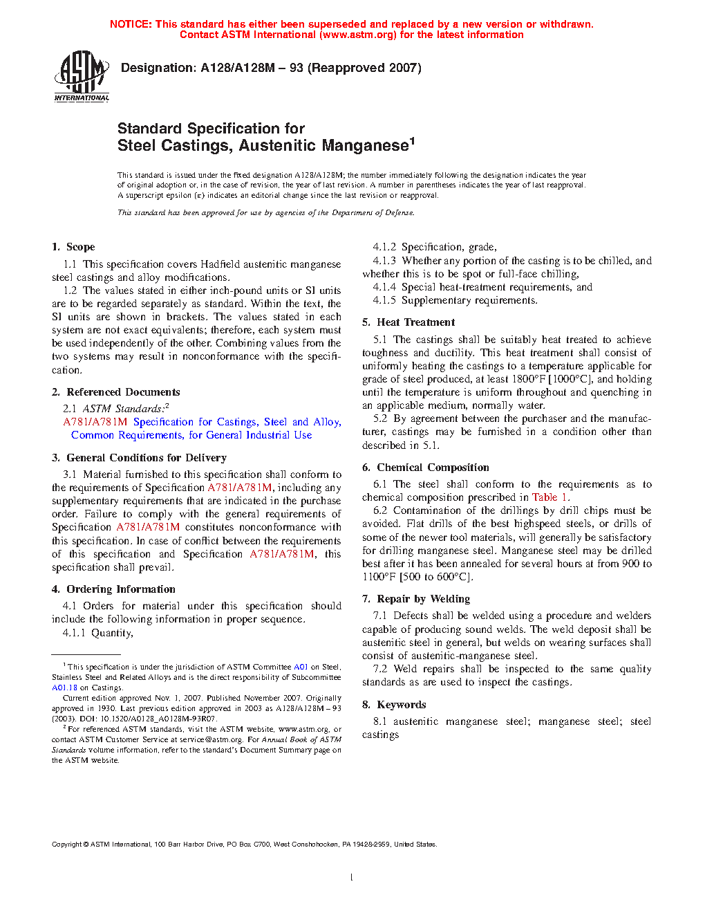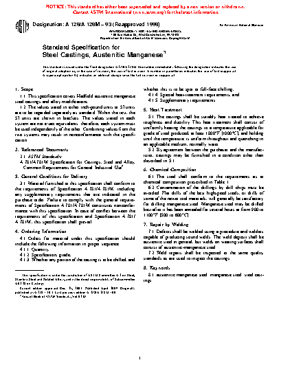 1.1 This specification covers Hadfield austenitic manganese steel castings and alloy modifications.