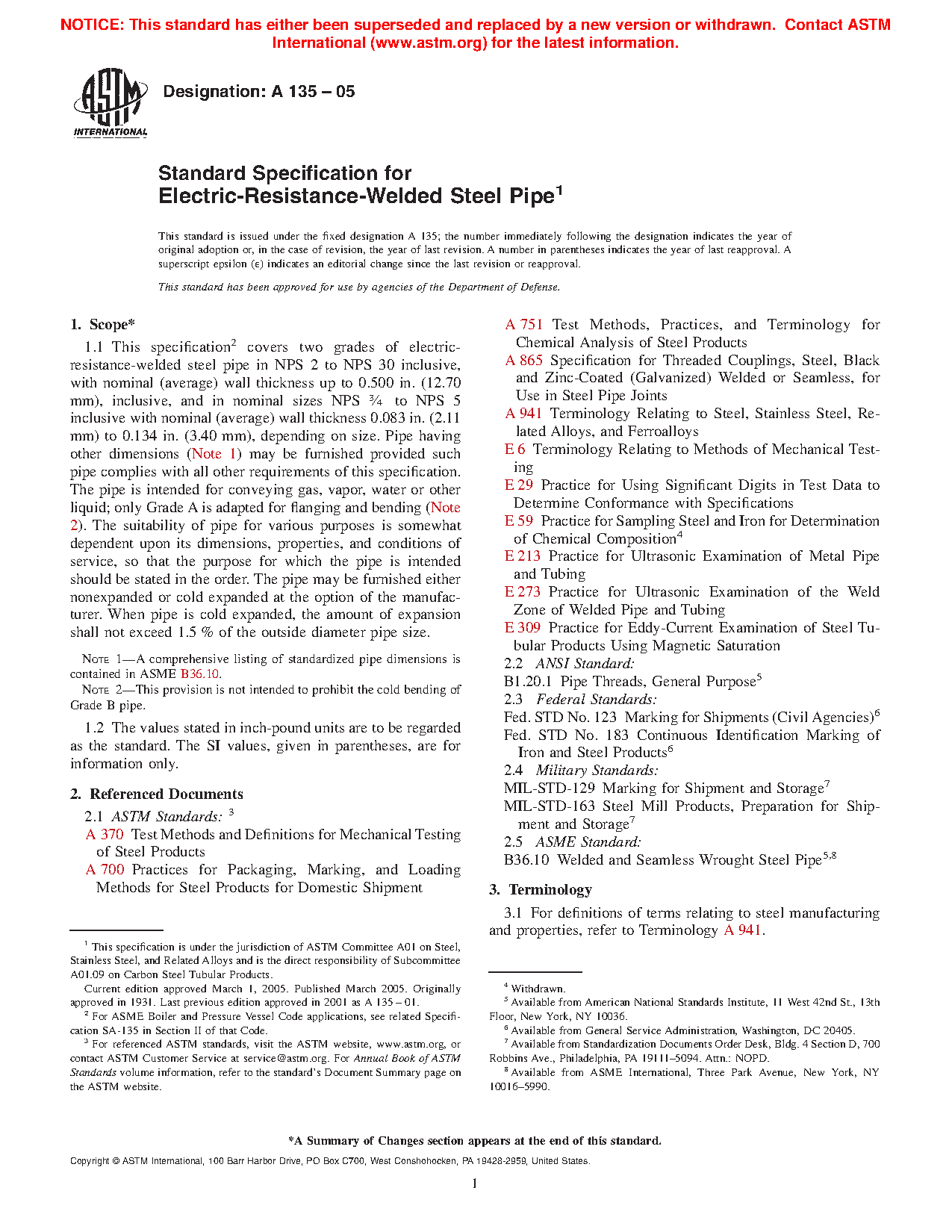 This specification covers two grades of electric-resistance-welded steel pipe intended for conveying gas, vapor, water or other liquid. The steel shall be made by either or both basic-oxygen or electric-furnace processes. Steel may be cast in ingots or may be strand cast. The pipe shall be manufactured from flat rolled steel in individual lengths or continuous length by electric-resistance or electric-induction welding without the addition of extraneous material. The weld seam of electric-resistance welded pipe to Grade B pipe shall be heat treated after welding or processed in such a manner that no untempered martensite remains. Tensile and chemical requirements of the steel are provided. Specimens of the steel pipes are subject to flattening test and hydrostatic test. A nondestructive electric test, either electromagnetic (eddy current) or ultrasonic test, may be preferred as an alternate to the hydrostatic test.