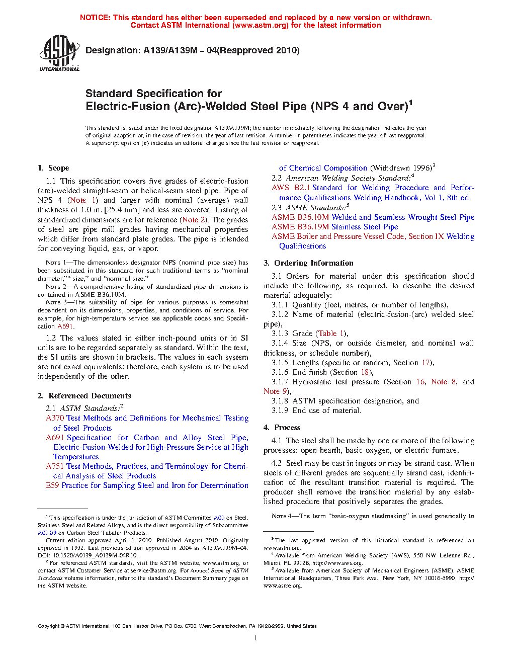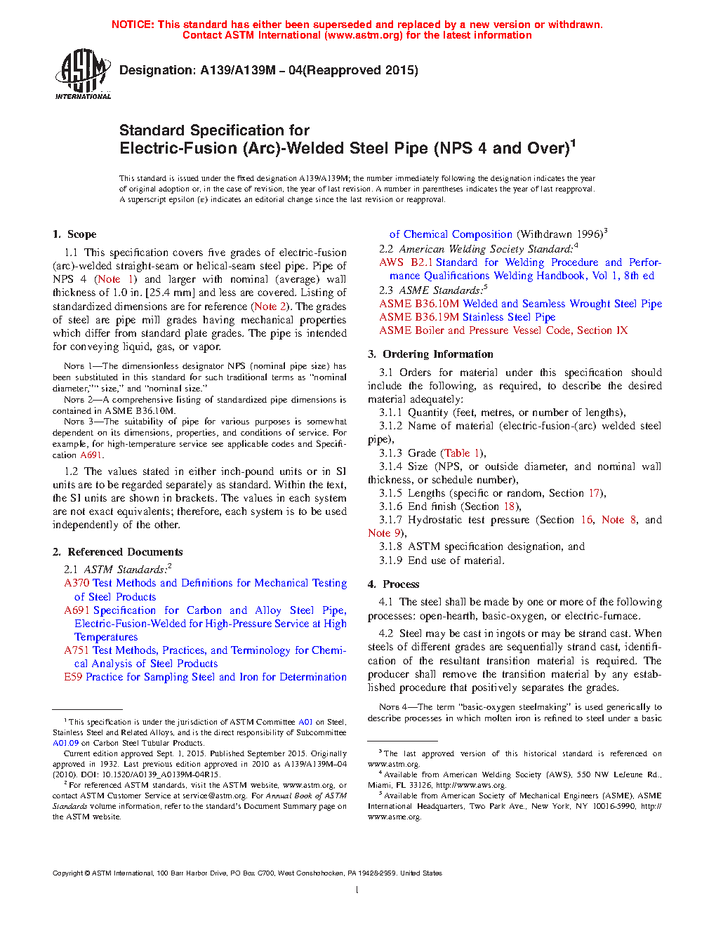 1.1 This specification covers five grades of electric-fusion (arc)-welded straight-seam or helical-seam steel pipe. Pipe of NPS 4 (Note 1) and larger with nominal (average) wall thickness of 1.0 in. [25.4 mm] and less are covered. Listing of standardized dimensions are for reference (Note 2). The grades of steel are pipe mill grades having mechanical properties which differ from standard plate grades. The pipe is intended for conveying liquid, gas, or vapor.