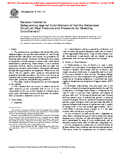 1.1 This practice covers procedures that can be followed to safeguard against the possible embrittlement of steel hot-dip galvanized after fabrication, and outlines test procedures for detecting embrittlement. Conditions of fabrication may induce a susceptibility to embrittlement in certain steels that can be accelerated by galvanizing. Embrittlement is not a common occurrence, however, and this discussion does not imply that galvanizing increases embrittlement where good fabricating and galvanizing procedures are employed. Where history has shown that for specific steels, processes and galvanizing procedures have been satisfactory, this history will serve as an indication that no embrittlement problem is to be expected for those steels, processes, and galvanizing procedures.