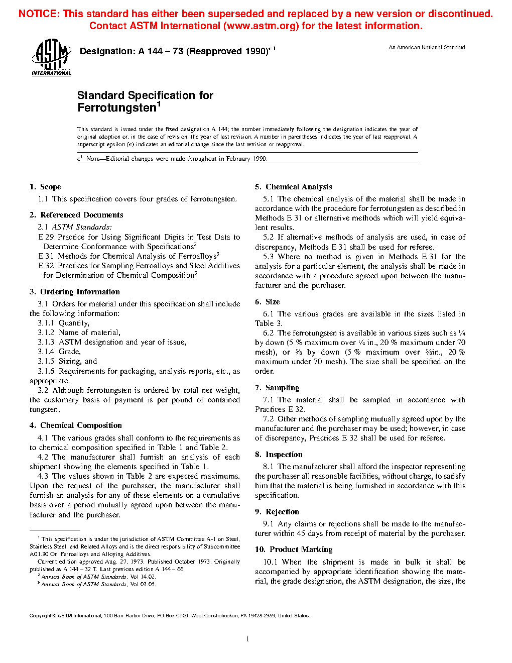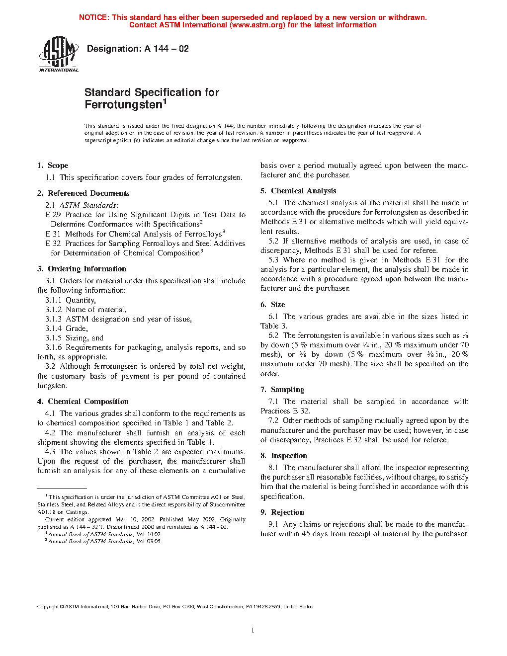 This guide covers standard specification for several grades of ferrotungsten. The material shall conform to the required chemical composition for tungsten, carbon, phosphorus, sulfur, silicon, molybdenum, and aluminum. The material shall also conform to supplementary chemical requirements for manganese, copper, nickel, arsenic, antimony, tin, and bismuth. Various grades of steel shall be available in specified sizes that meet the required size tolerance.