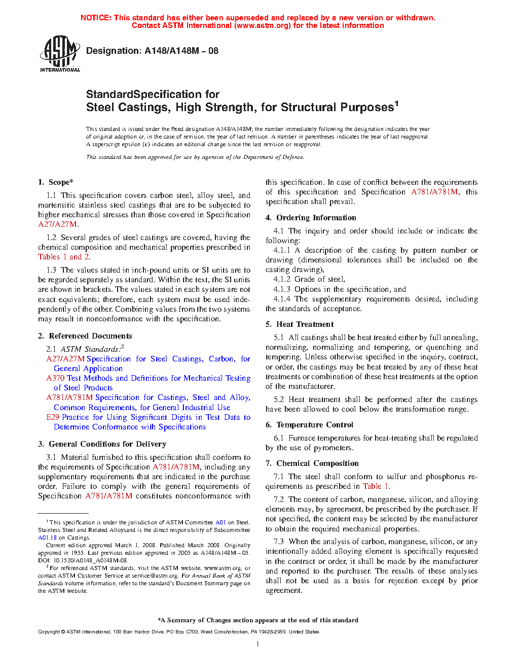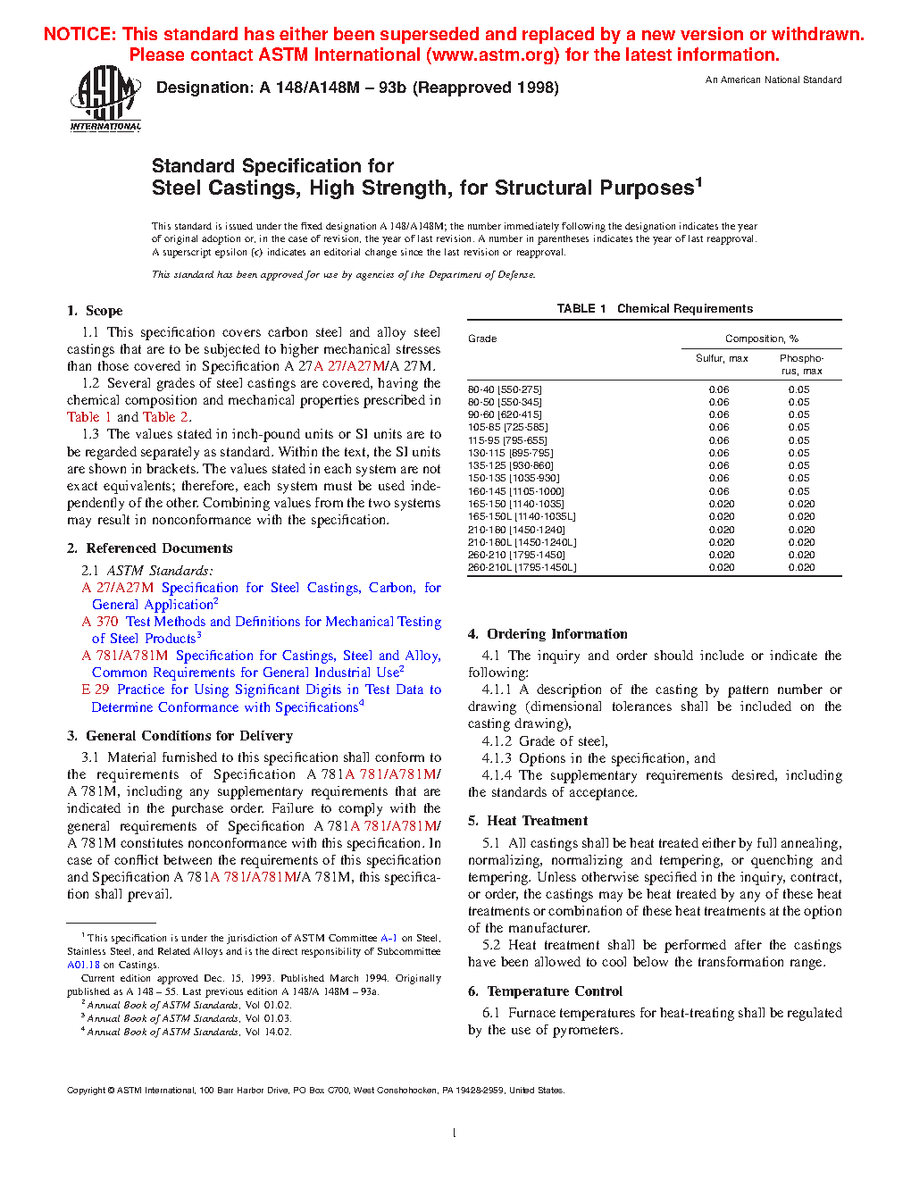 This specification covers the standard for carbon steel, alloy steel, and martensitic stainless steel castings that are to be subjected to higher mechanical stresses. All castings shall undergo heat treatment either by full annealing, normalizing, normalizing and tempering, or quenching and tempering and shall be regulated under pyrometers. Several grades of steel castings are covered and shall conform to the required chemical composition for sulfur and phosphorus. A tension test shall be performed and shall conform to the required tensile strength, yield point, and elongation. The notch bar impact properties shall also be determined by testing one set of three Charpy V-notch impact specimens.