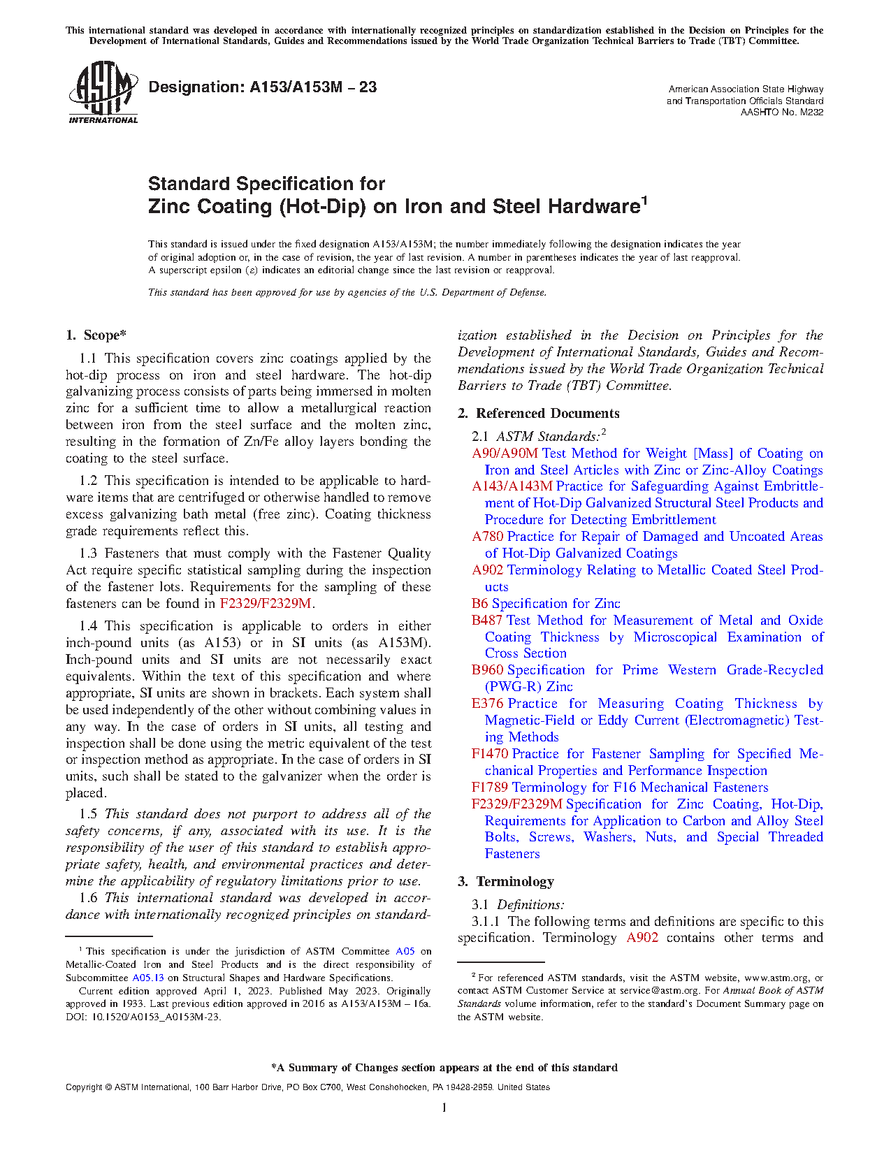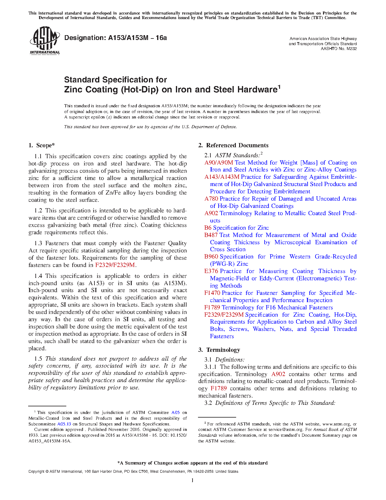 1.1 This specification covers zinc coatings applied by the hot-dip process on iron and steel hardware.