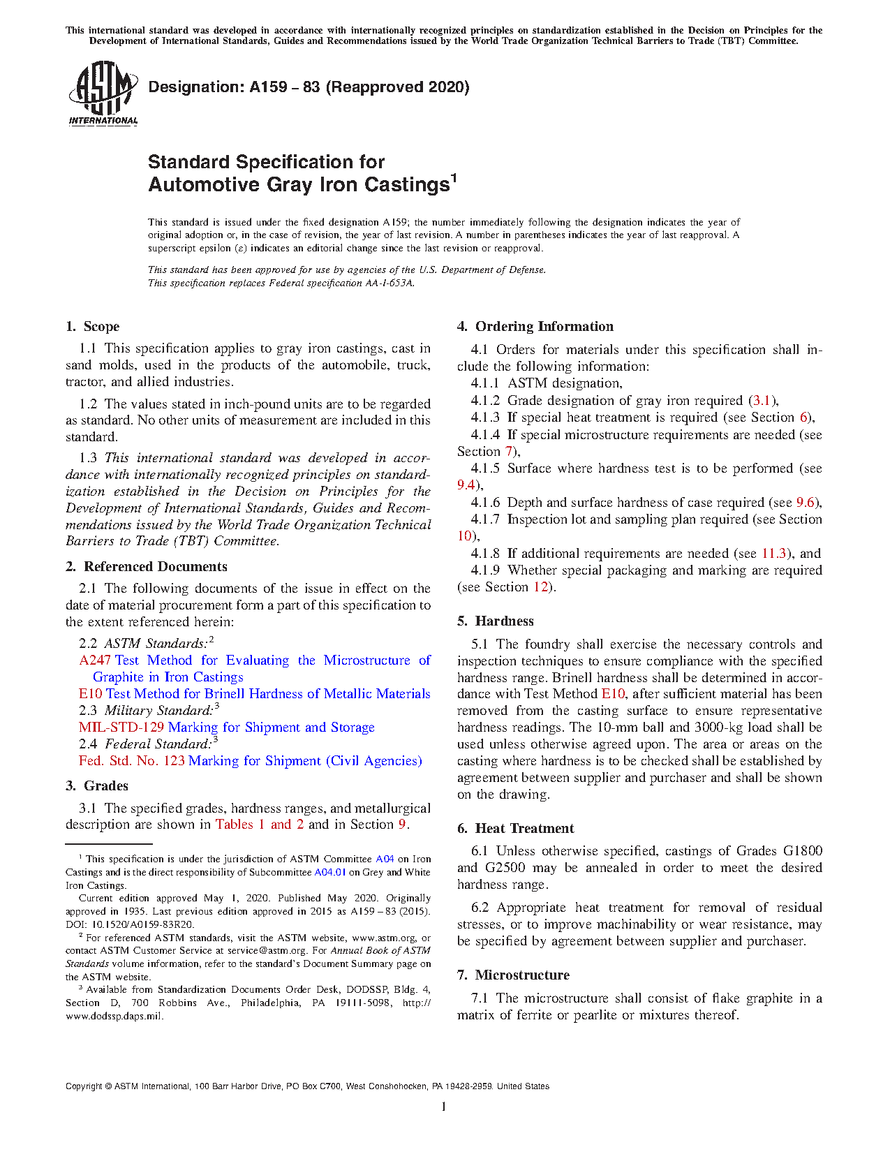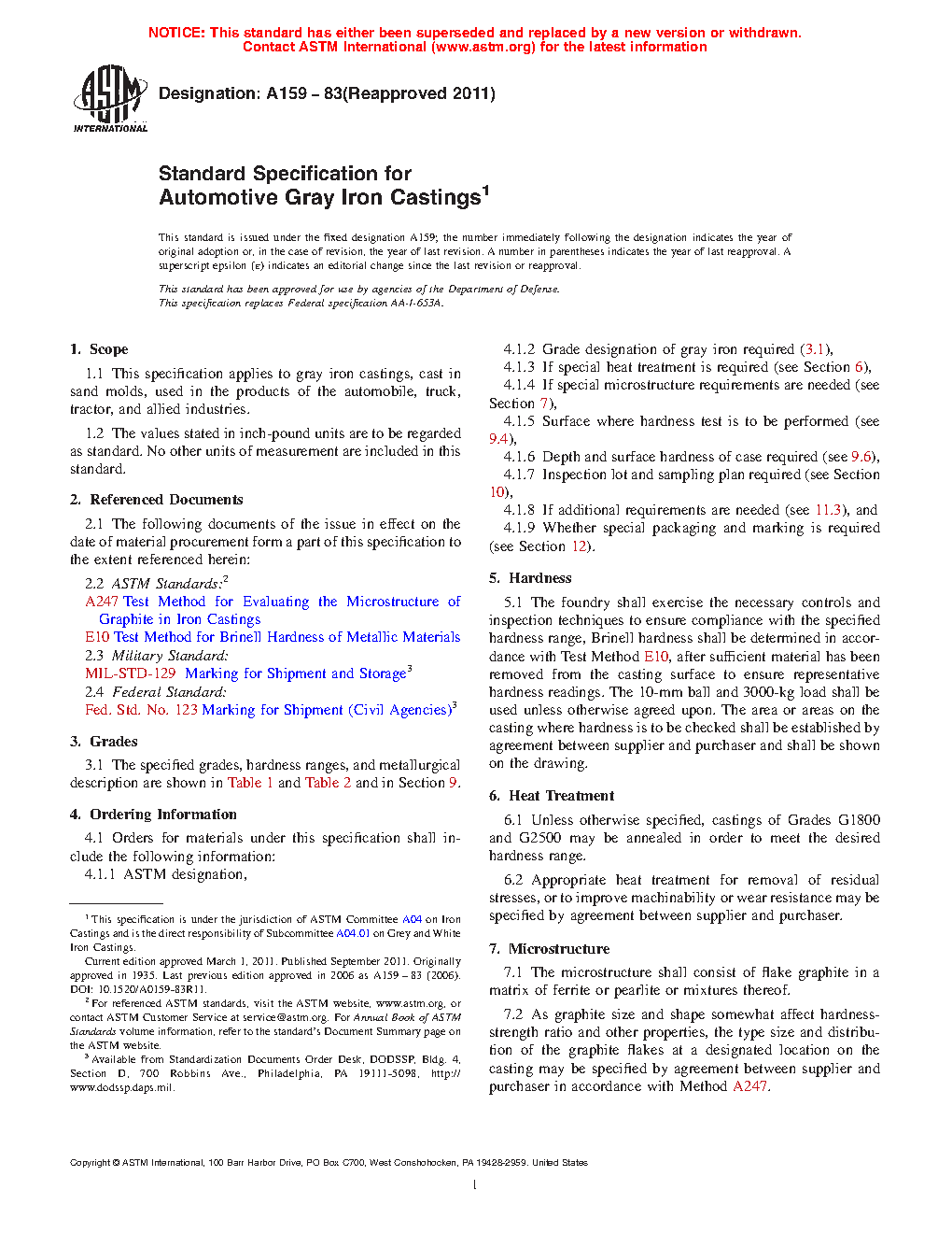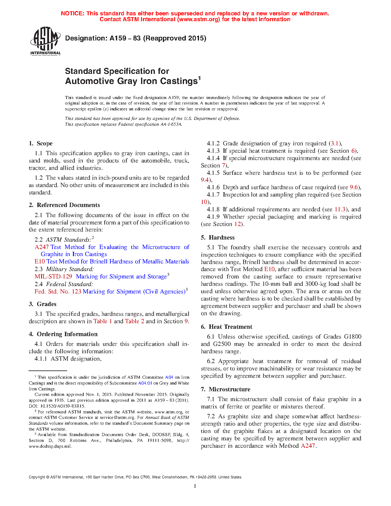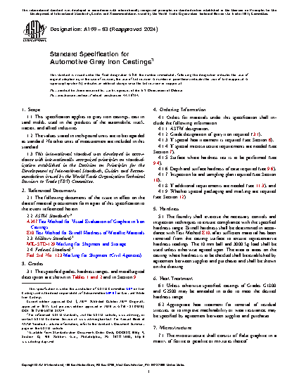 1.1 This specification applies to gray iron castings, cast in sand molds, used in the products of the automobile, truck, tractor, and allied industries.