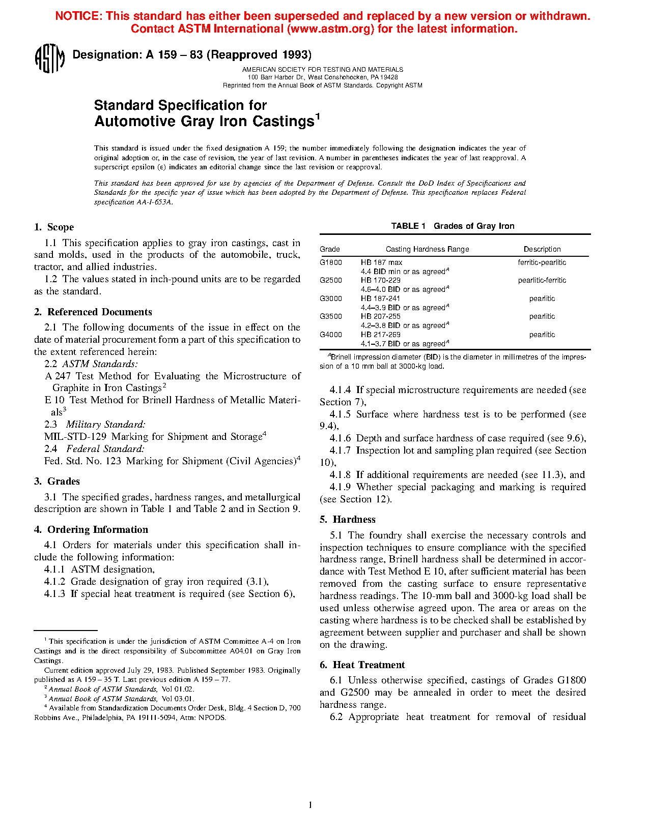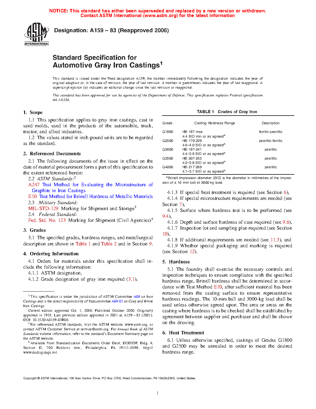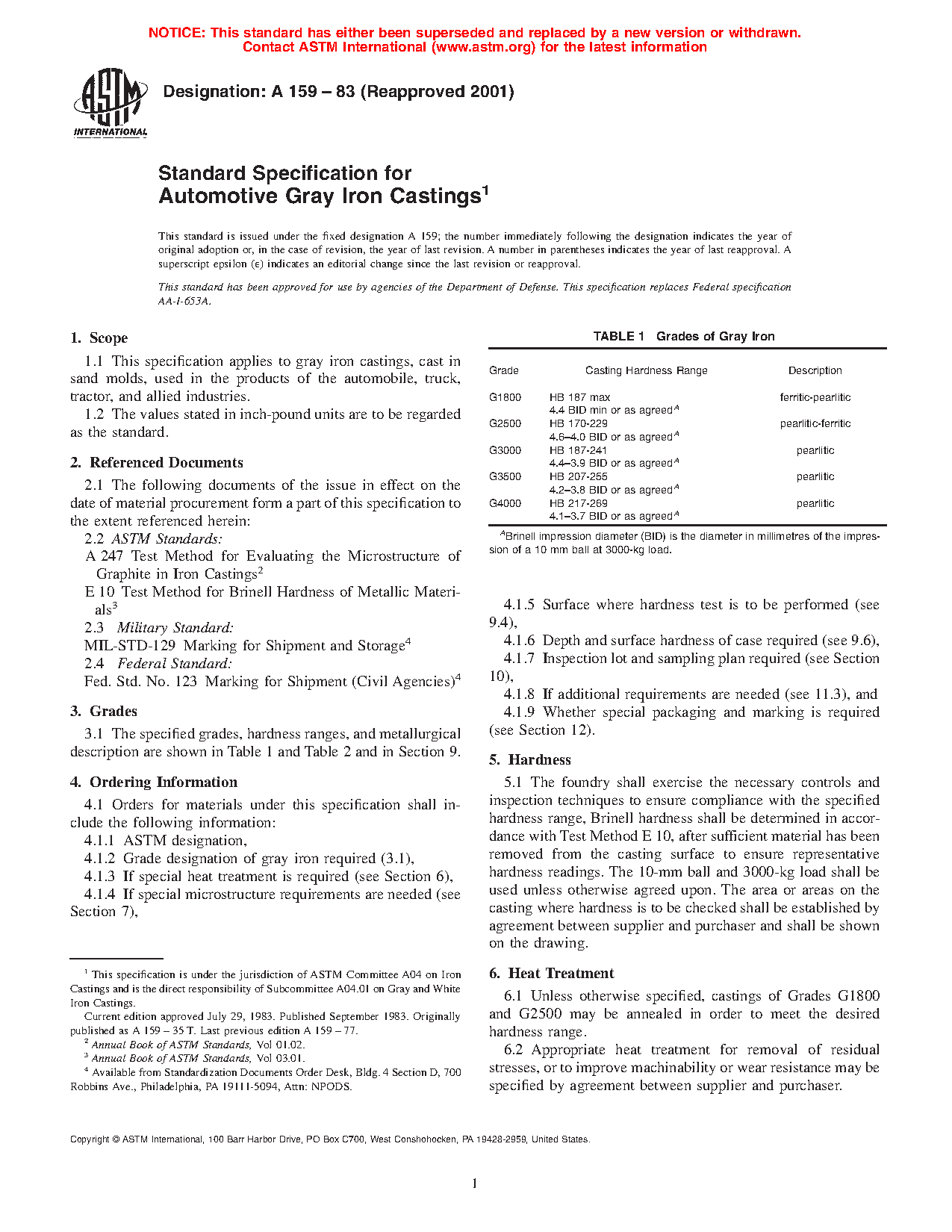 1.1 This specification applies to gray iron castings, cast in sand molds, used in the products of the automobile, truck, tractor, and allied industries.