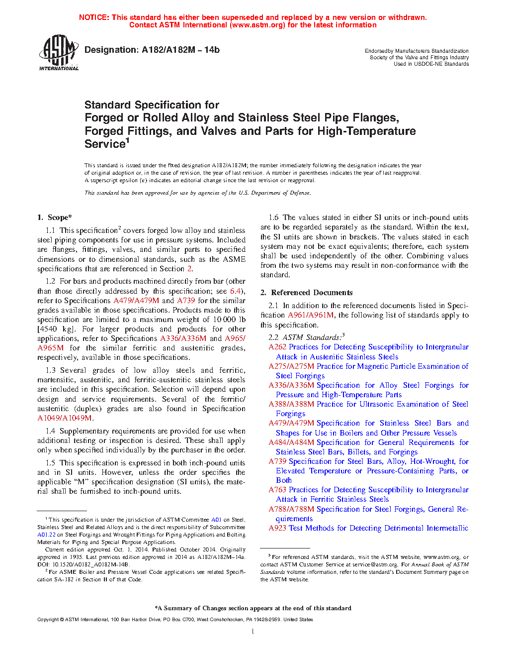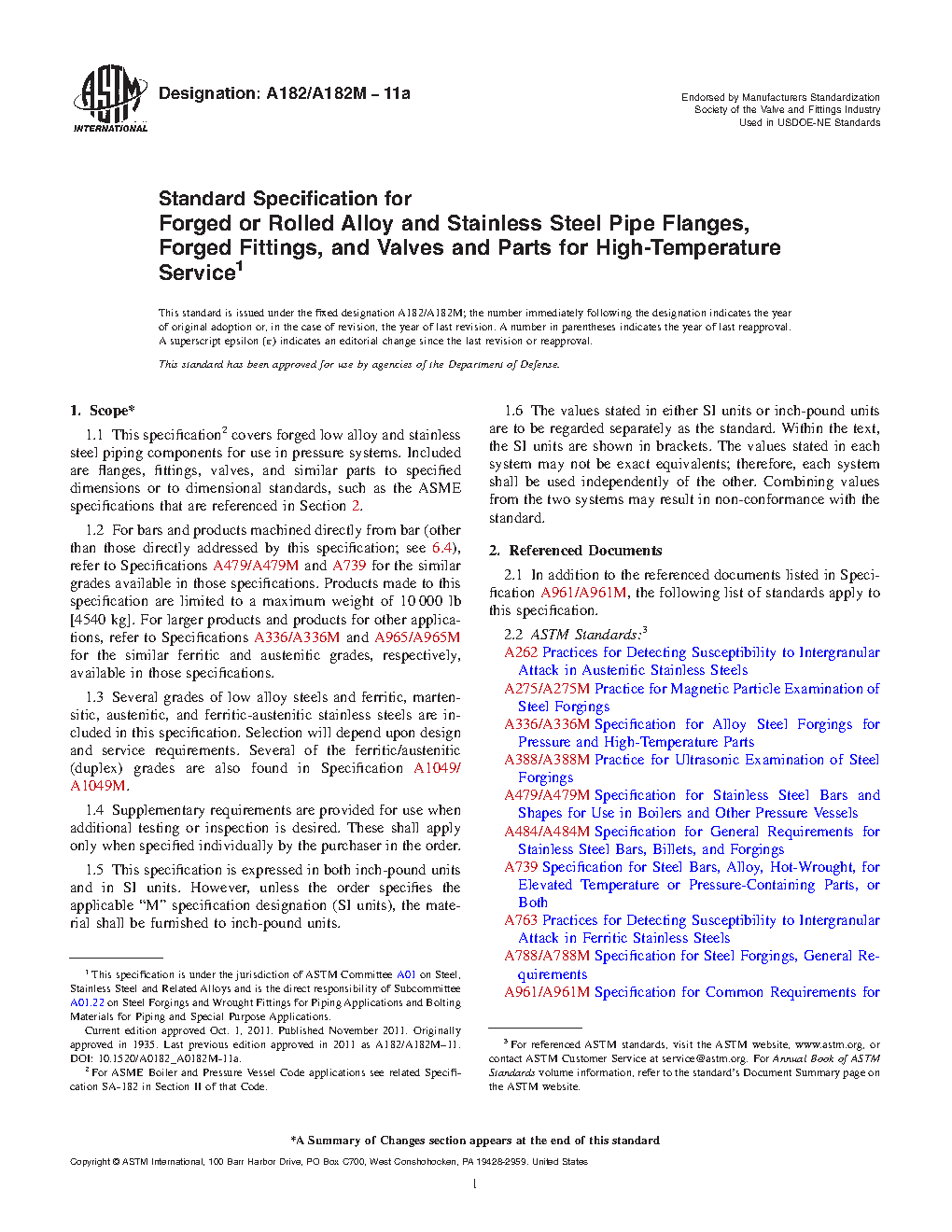 1.1 This specification2 covers forged low alloy and stainless steel piping components for use in pressure systems. Included are flanges, fittings, valves, and similar parts to specified dimensions or to dimensional standards, such as the ASME specifications that are referenced in Section 2.