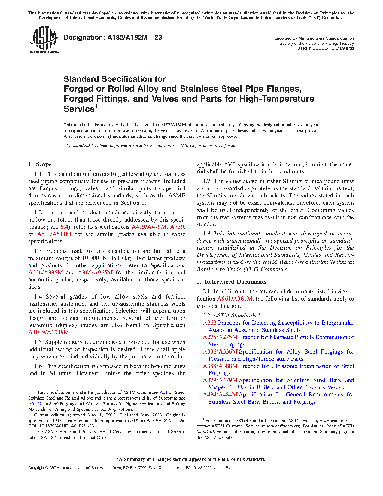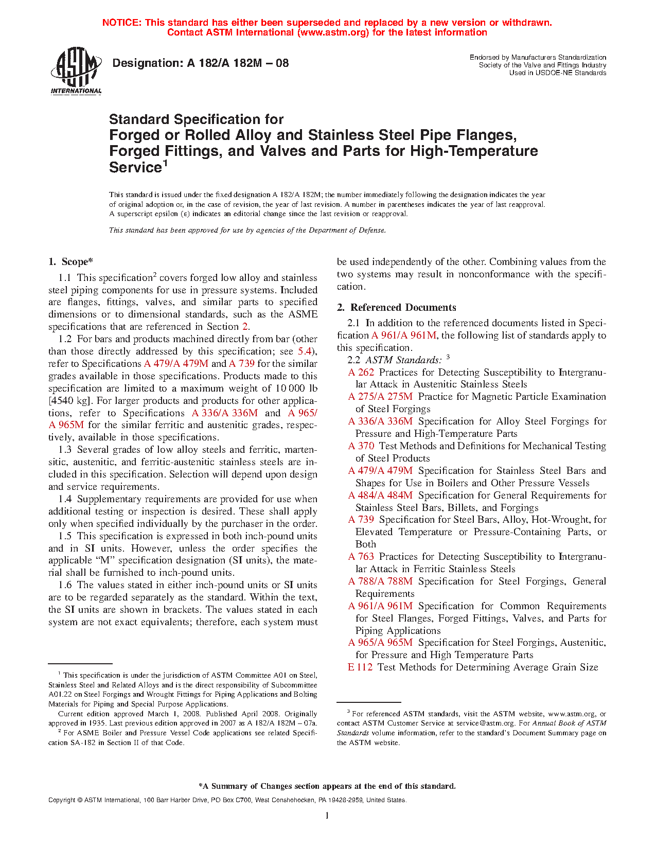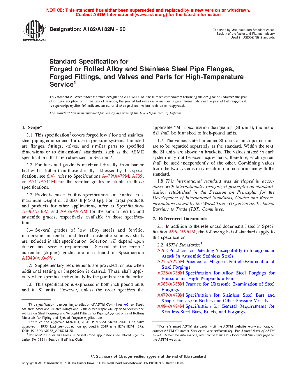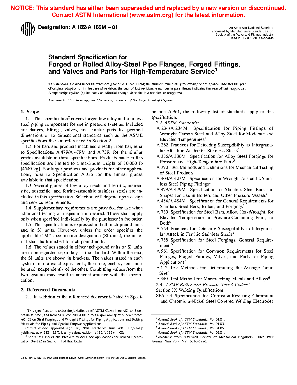 1.1 This specification2 covers forged low alloy and stainless steel piping components for use in pressure systems. Included are flanges, fittings, valves, and similar parts to specified dimensions or to dimensional standards, such as the ASME specifications that are referenced in Section 2.