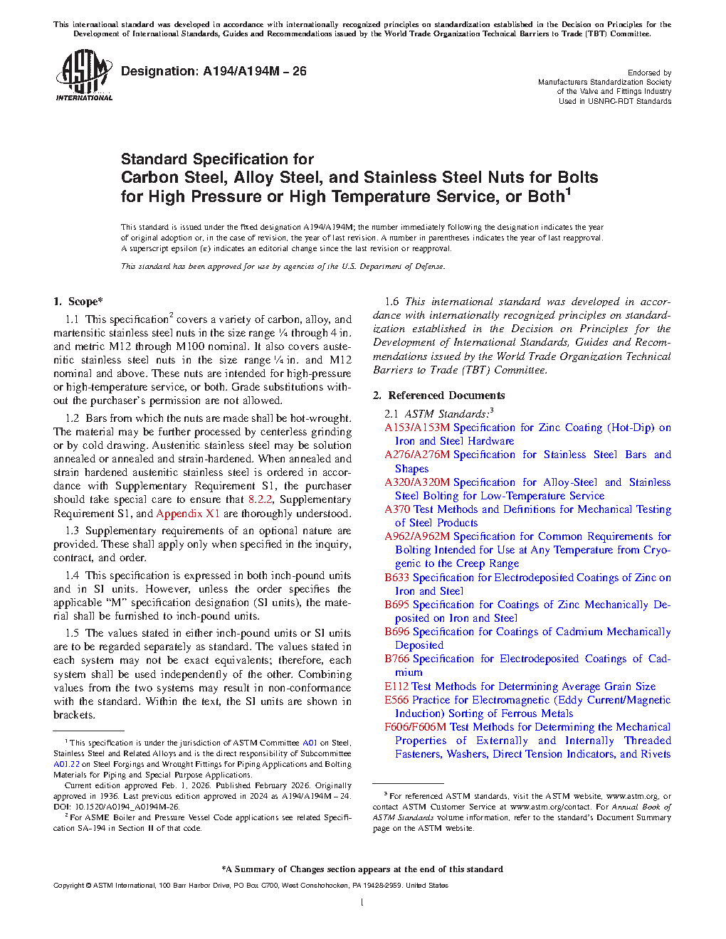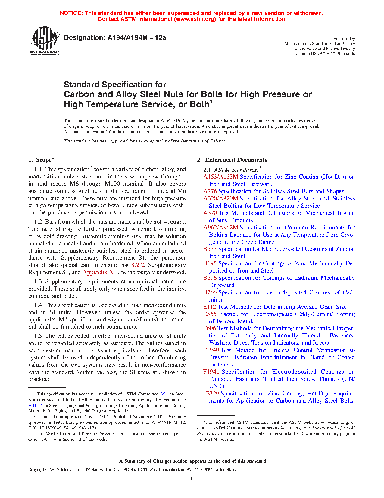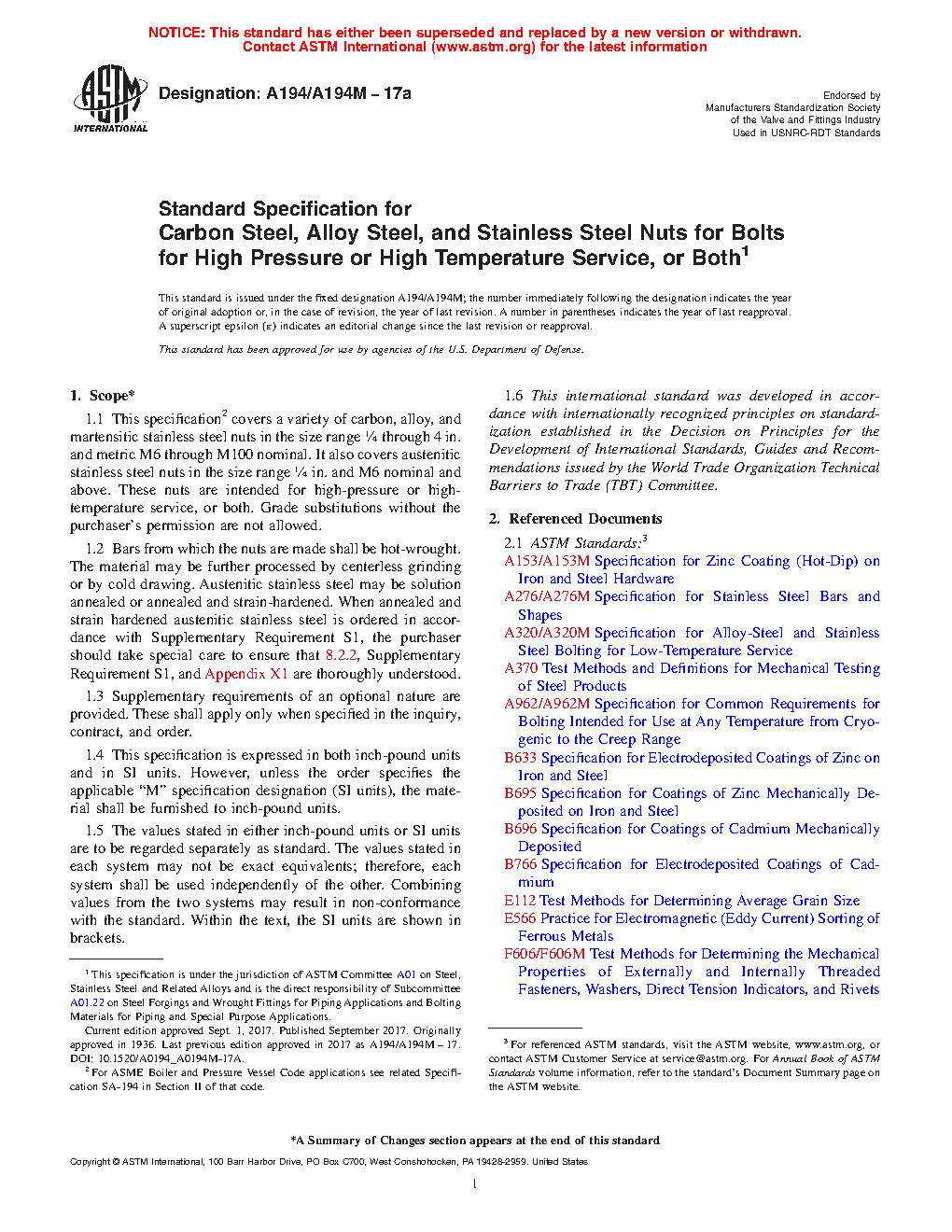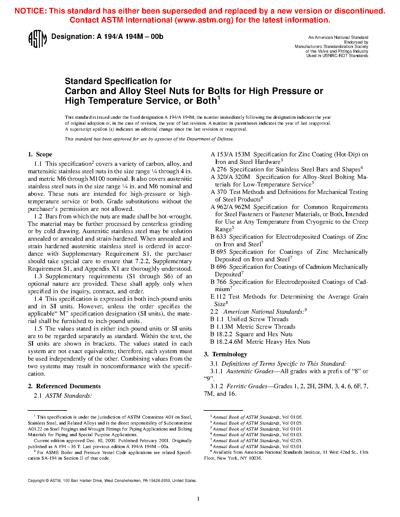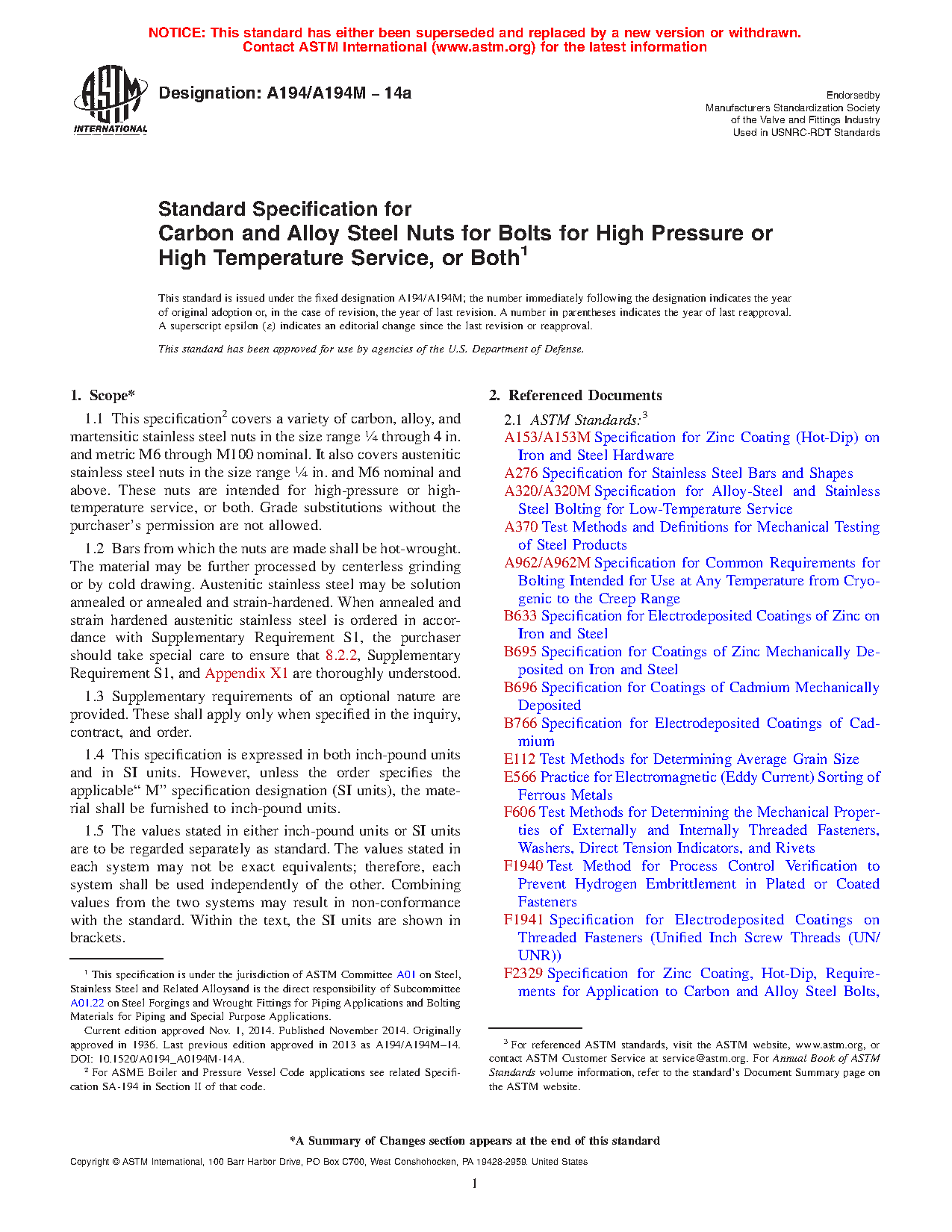 1.1 This specification2 covers a variety of carbon, alloy, and martensitic stainless steel nuts in the size range 1/4 through 4 in. and metric M6 through M100 nominal. It also covers austenitic stainless steel nuts in the size range 1/4 in. and M6 nominal and above. These nuts are intended for high-pressure or high-temperature service, or both. Grade substitutions without the purchaser's permission are not allowed.