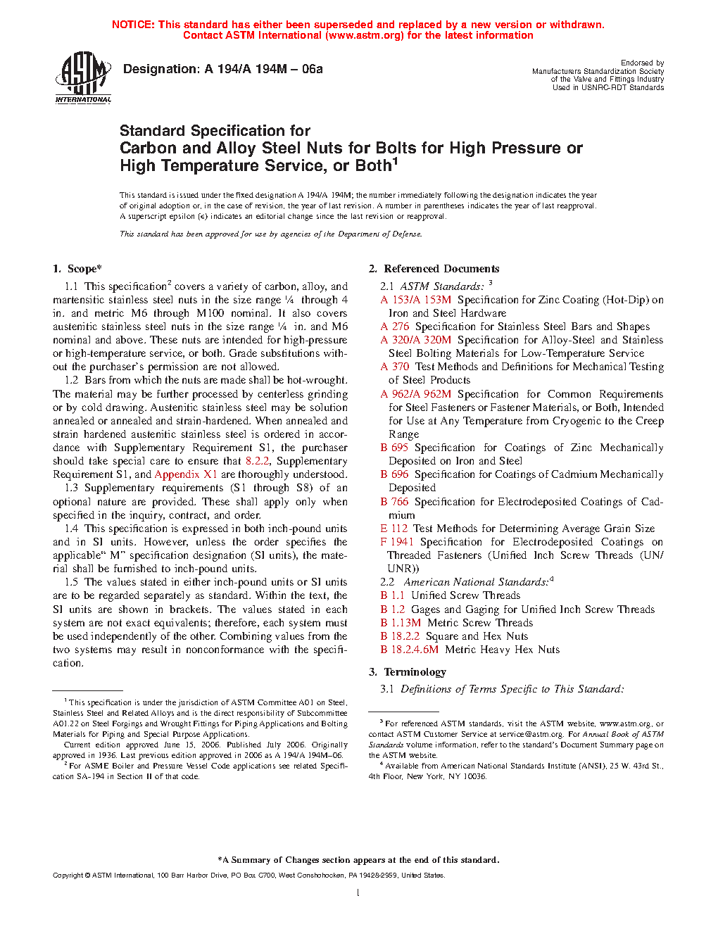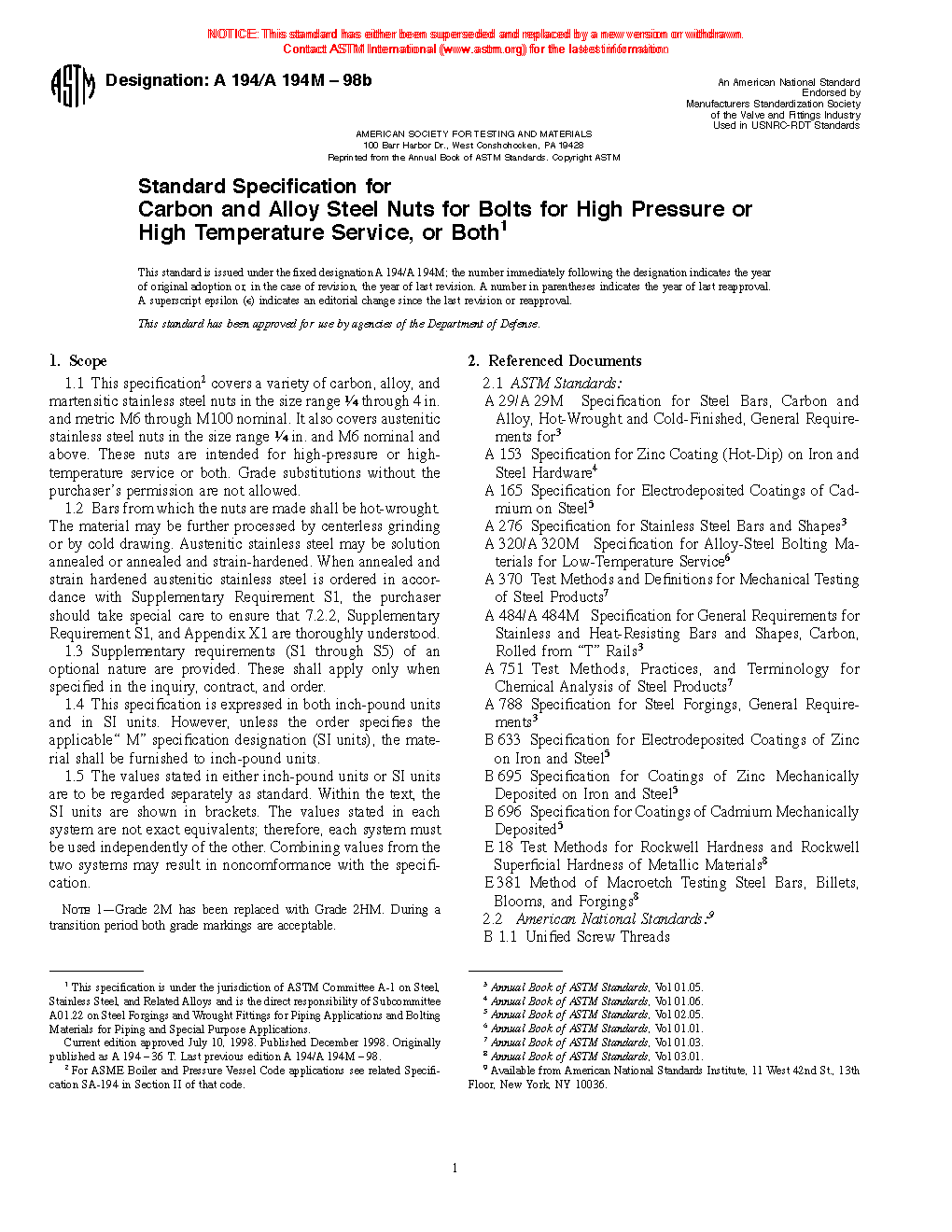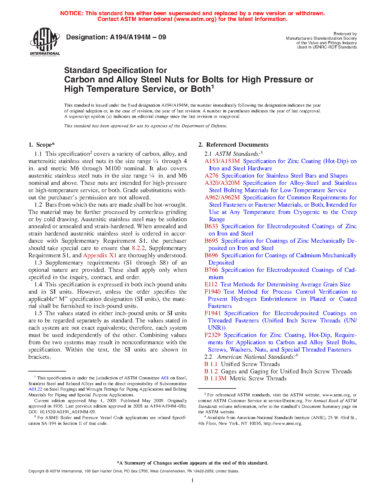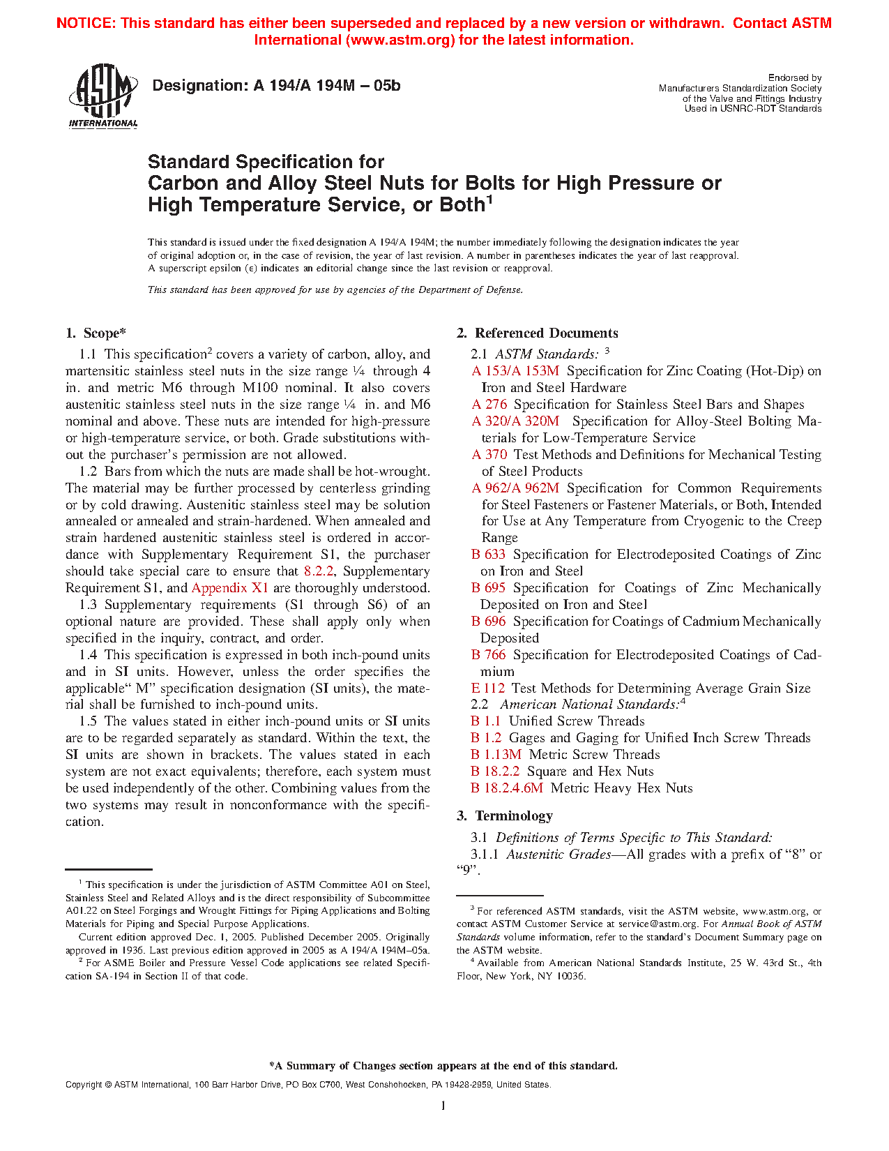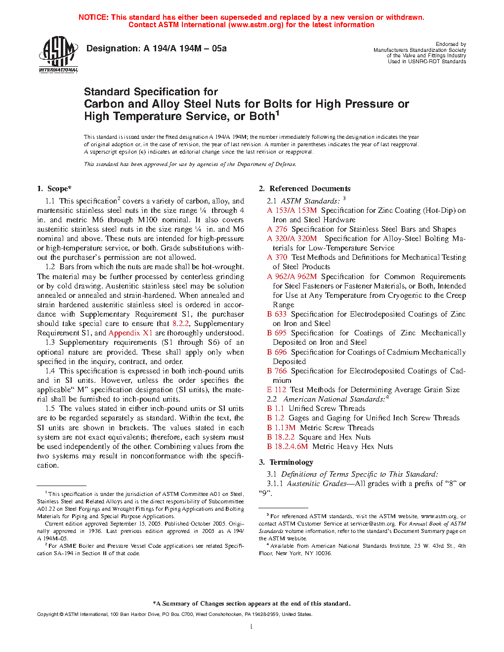 1.1 This specification2 covers a variety of carbon, alloy, and martensitic stainless steel nuts in the size range 1/4 through 4 in. and metric M6 through M100 nominal. It also covers austenitic stainless steel nuts in the size range 1/4 in. and M6 nominal and above. These nuts are intended for high-pressure or high-temperature service, or both. Grade substitutions without the purchaser's permission are not allowed.
